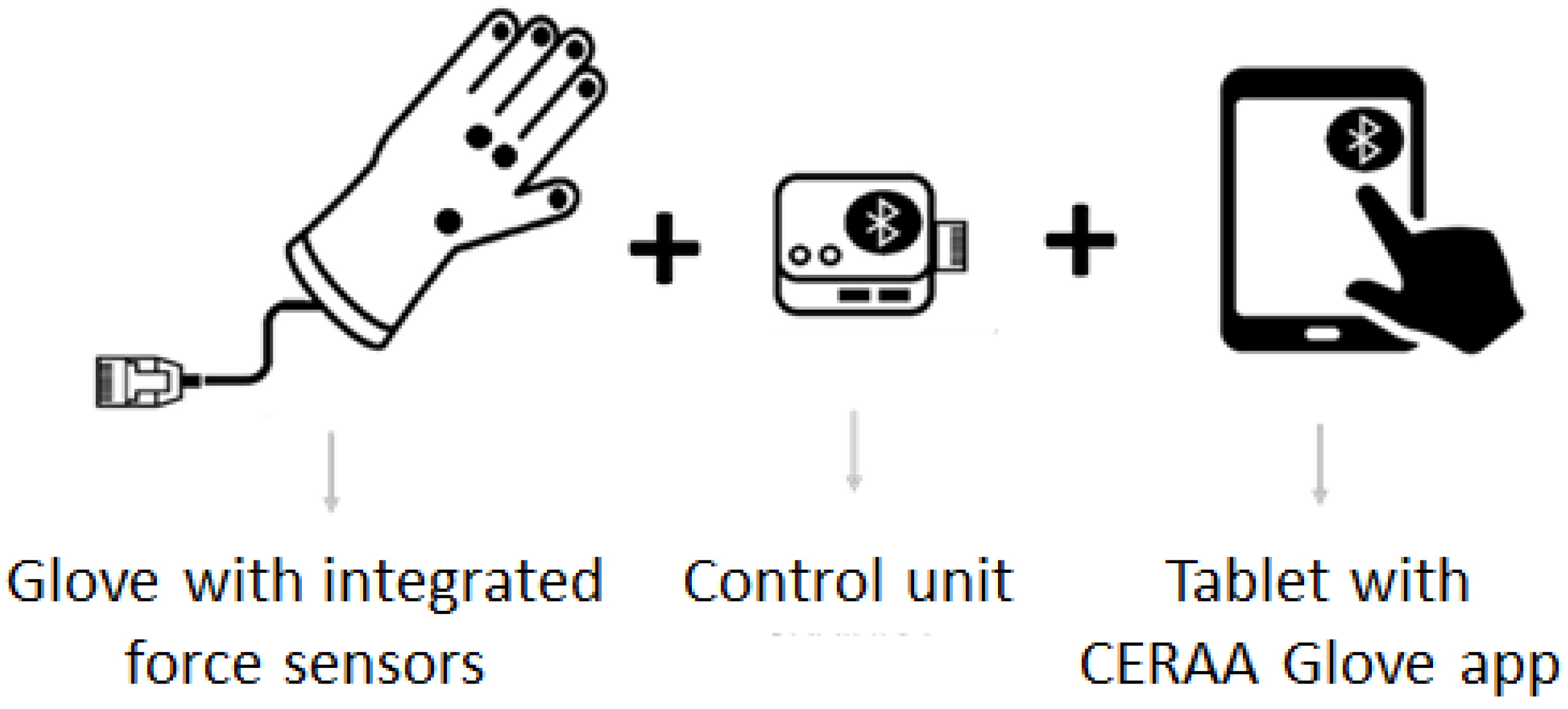 Figure 2). The control module can be positioned on the wrist or forearm of the participant. Data are displayed and stored using the in-house CERAA Glove App.