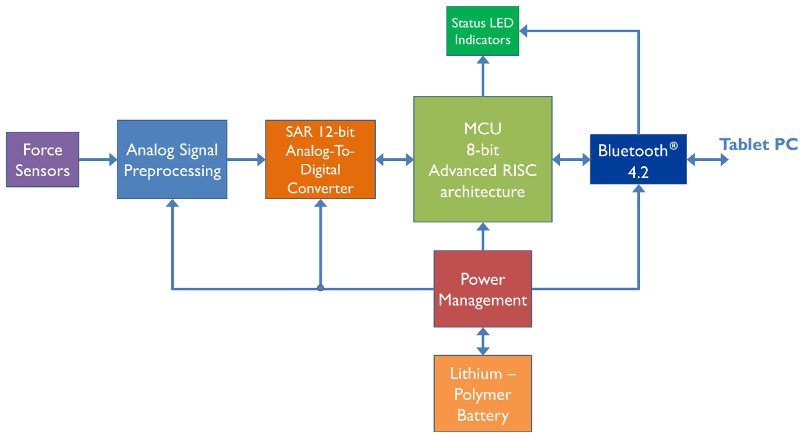 Figure 1 illustrates the design concept of the proposed measurement system. The core idea was to integrate sensors into a flexible, multifunctional glove to protect them from mechanical damage and to capture reliable measurement data. The analog circuitry first processes signals from the sensors, converts them into digital form, and then wirelessly transmits the data to the computer (see