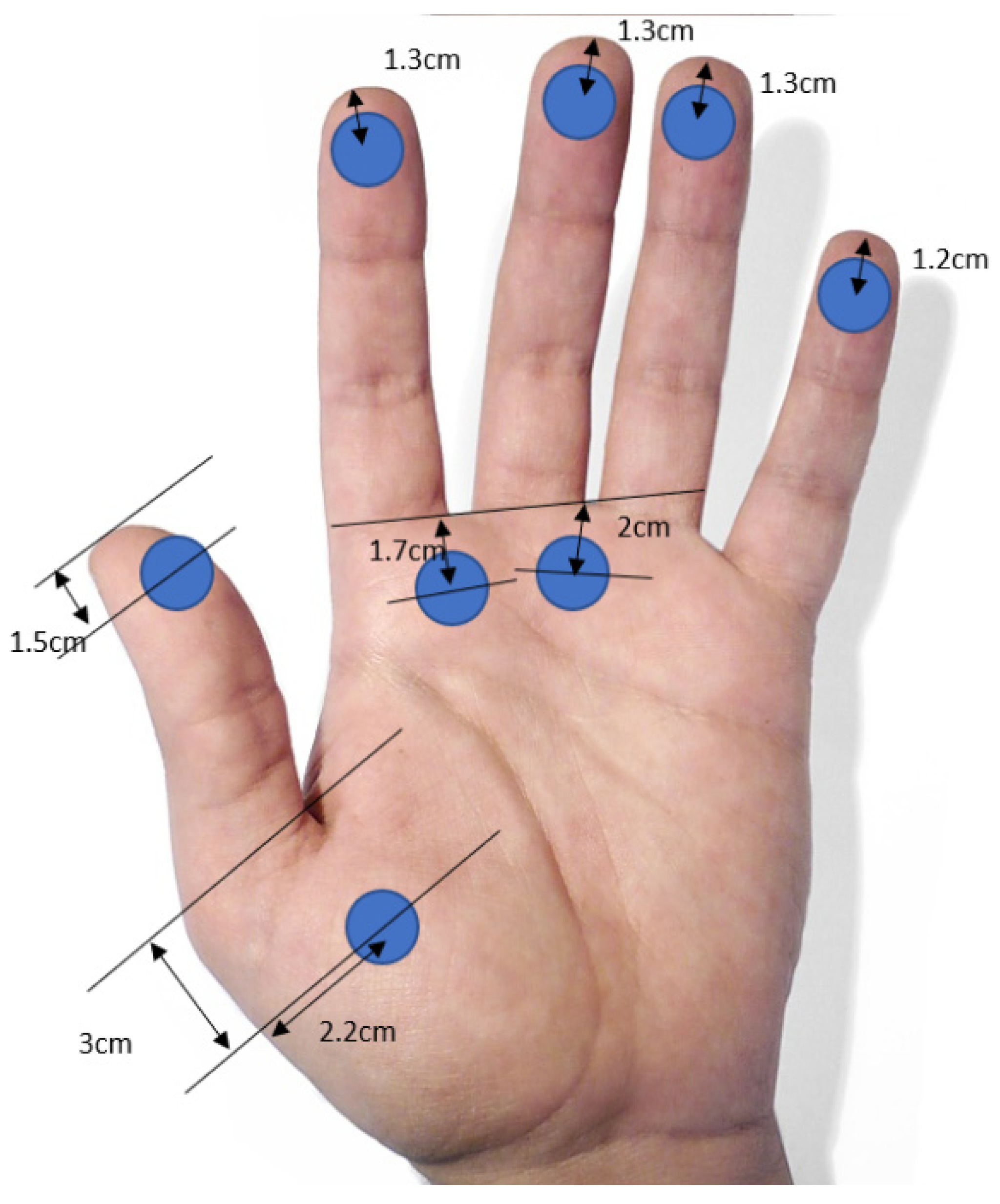 The developed smart glove system addresses user variability through several design features. The glove comes in four standard sizes (small, medium, large, extra-large) based on measurements of the adult population’s hands. The design of the FSR sensors provides flexibility for placement in contact areas with the most force (as illustrated in
