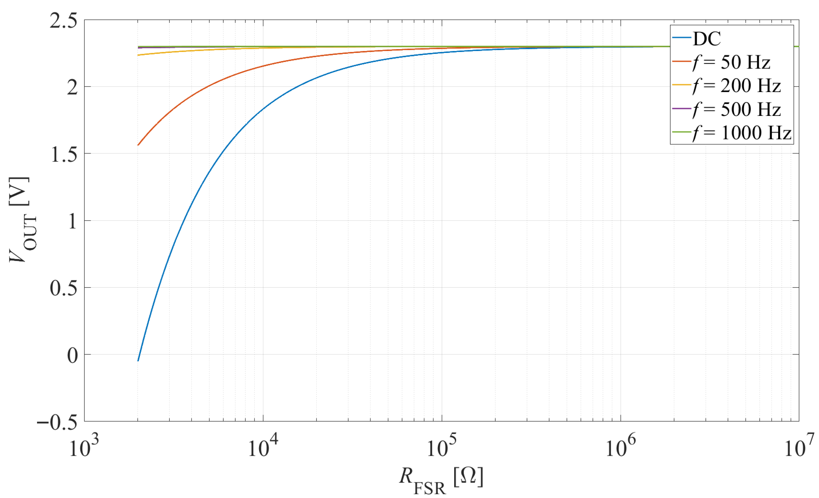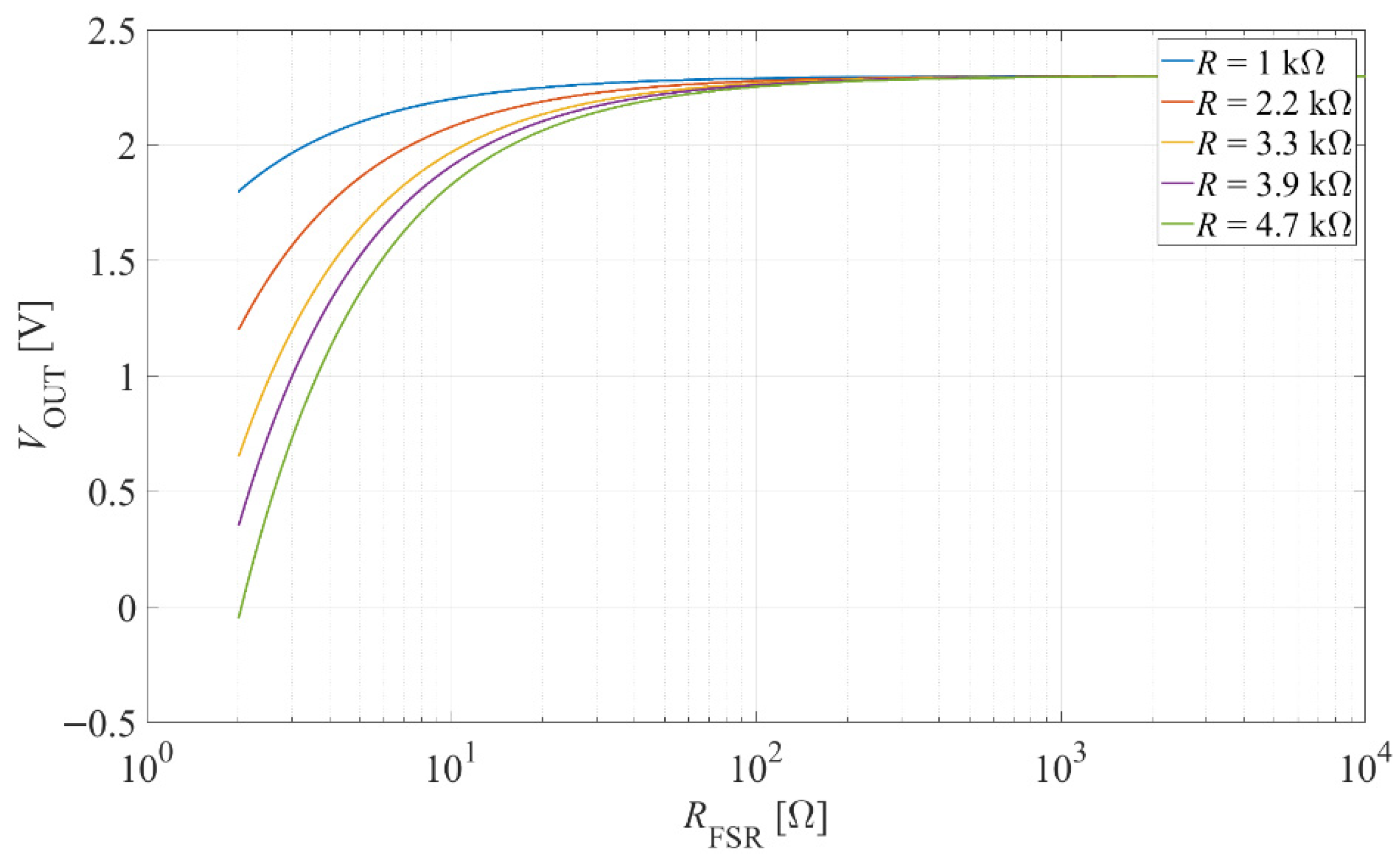 Figure 6 demonstrates that the output voltage range can be adjusted by selecting an appropriate RFSR value, which determines the circuit’s sensitivity to force variations. Therefore, the value of the feedback resistor has a direct impact on the circuit’s performance. A smaller resistor value results in lower sensitivity to changes in the applied force. Conversely, if the RFSR value is too large, the operational amplifier may become saturated when higher forces are applied to the sensor.