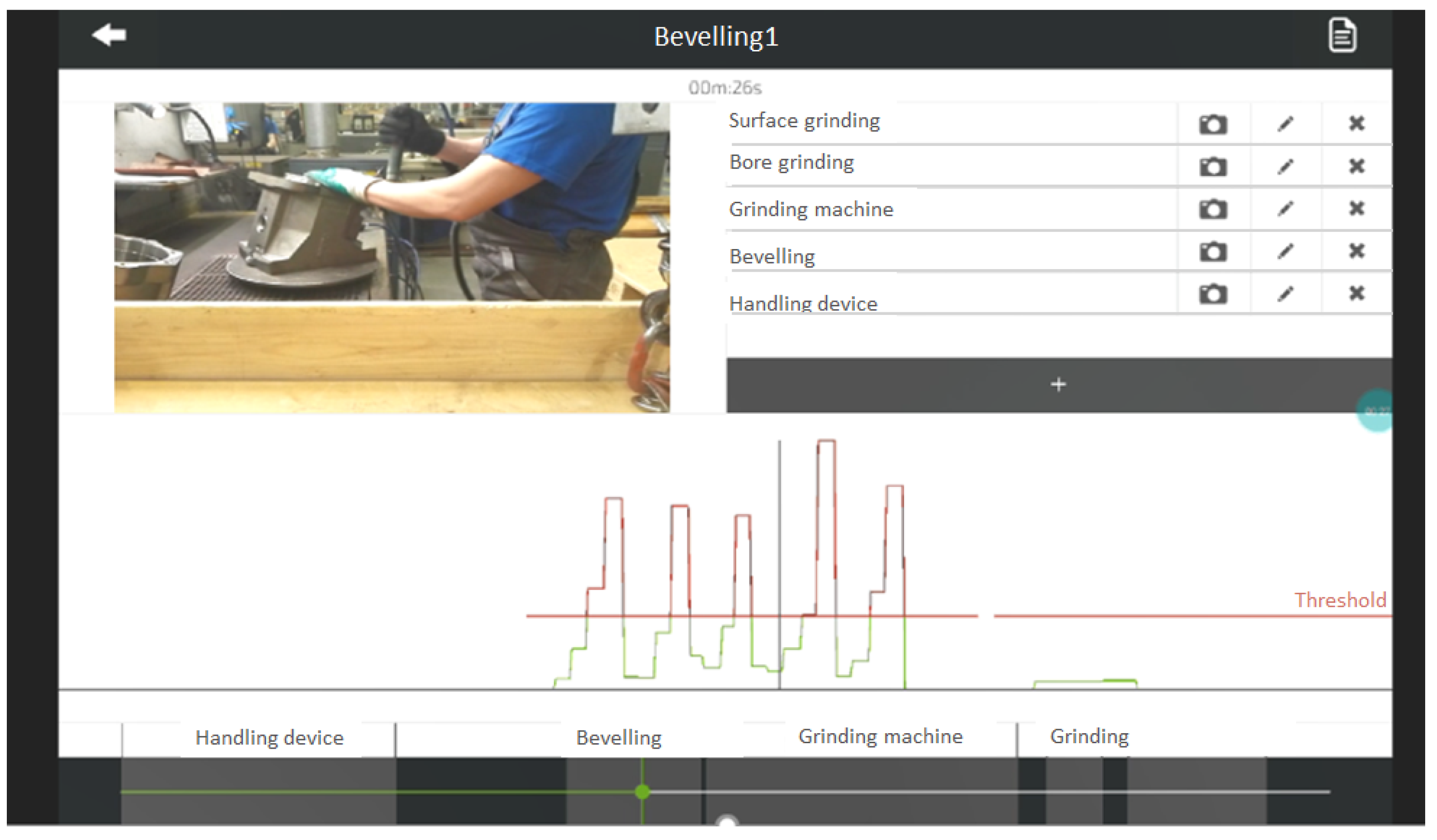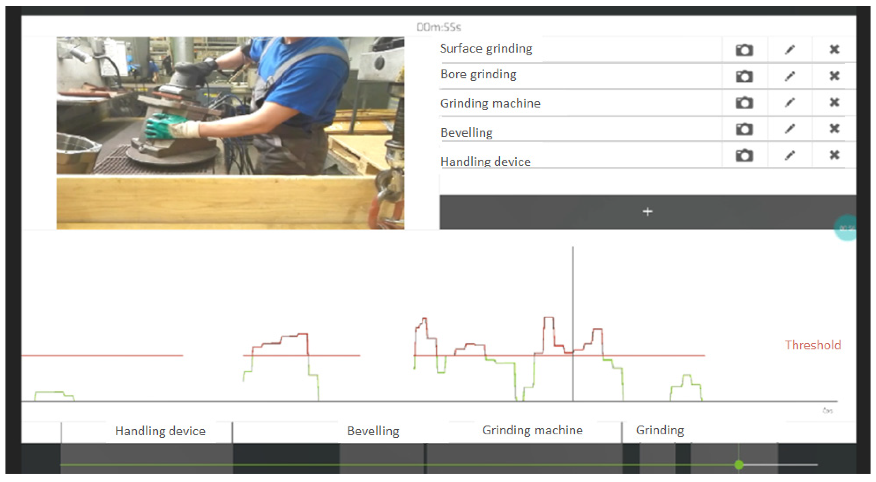 Figure 22), we present a measurement using a grinding machine. The worker completed two actions during the assessment: specifically, bevelling and grinding. The fundamental parameters as input data were as follows: