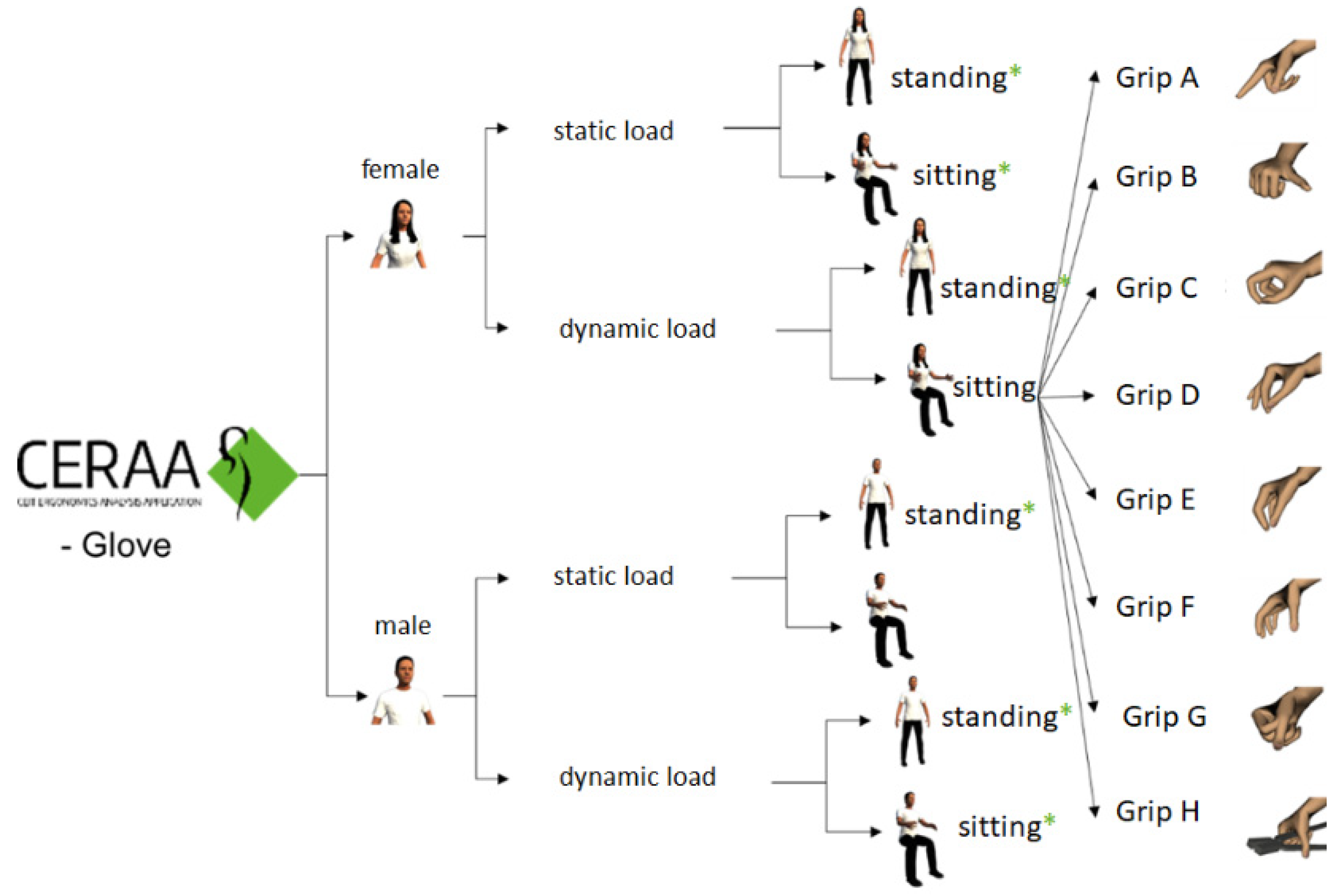 Typically, the developed exerted force is analyzed when handling different kinds of tools but also when tasks include connecting and manually handling small parts or components in the workplace, a variety of inspections, final assembly, packaging, and so on. In several cases, issues such as inadequate tool design, suboptimal working conditions, or improper handling techniques were identified as potential risk factors. Therefore, either the tool types changed or the working procedures were changed. The team was also trained to handle the specific tool used. During the evaluation, different types of hand grips were tested, since for each kind of hand grip there is a separate limit force for each working situation., e.g., after determining that a force exceeded the threshold, a different type/approach of handgrip would be suggested. The physical load could also be verified using the force measured by the smart glove due to the combination of cyclically repeated activities. This was compared to the standard OCRA method based on the “Safety of machinery—Human physical performance” in EN 1005-5 [