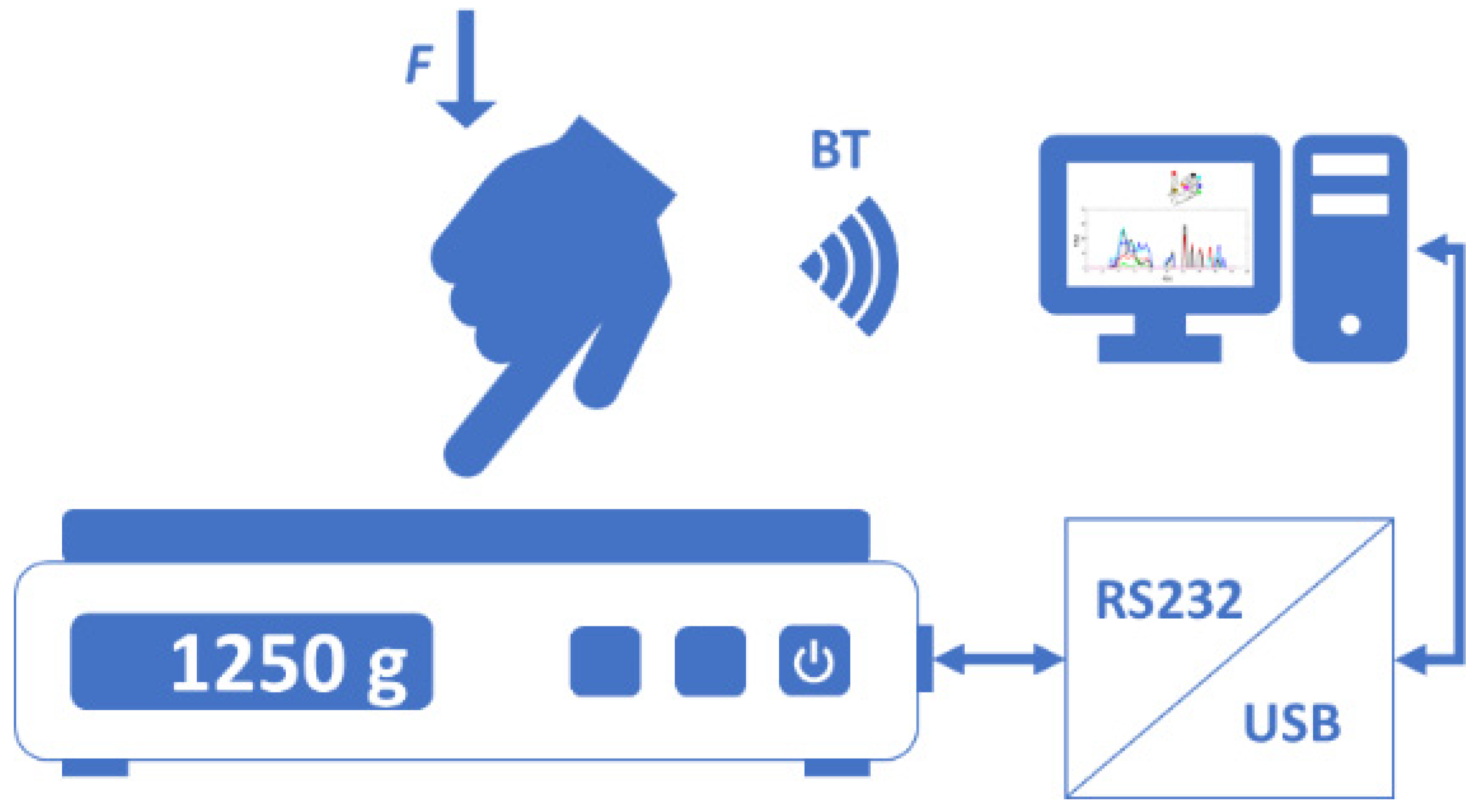 Figure 10. As a reference measuring system, a laboratory weight scale, which provided a digital output, was employed. The synchronized collection of data was enabled by this scale in combination with the device control unit.