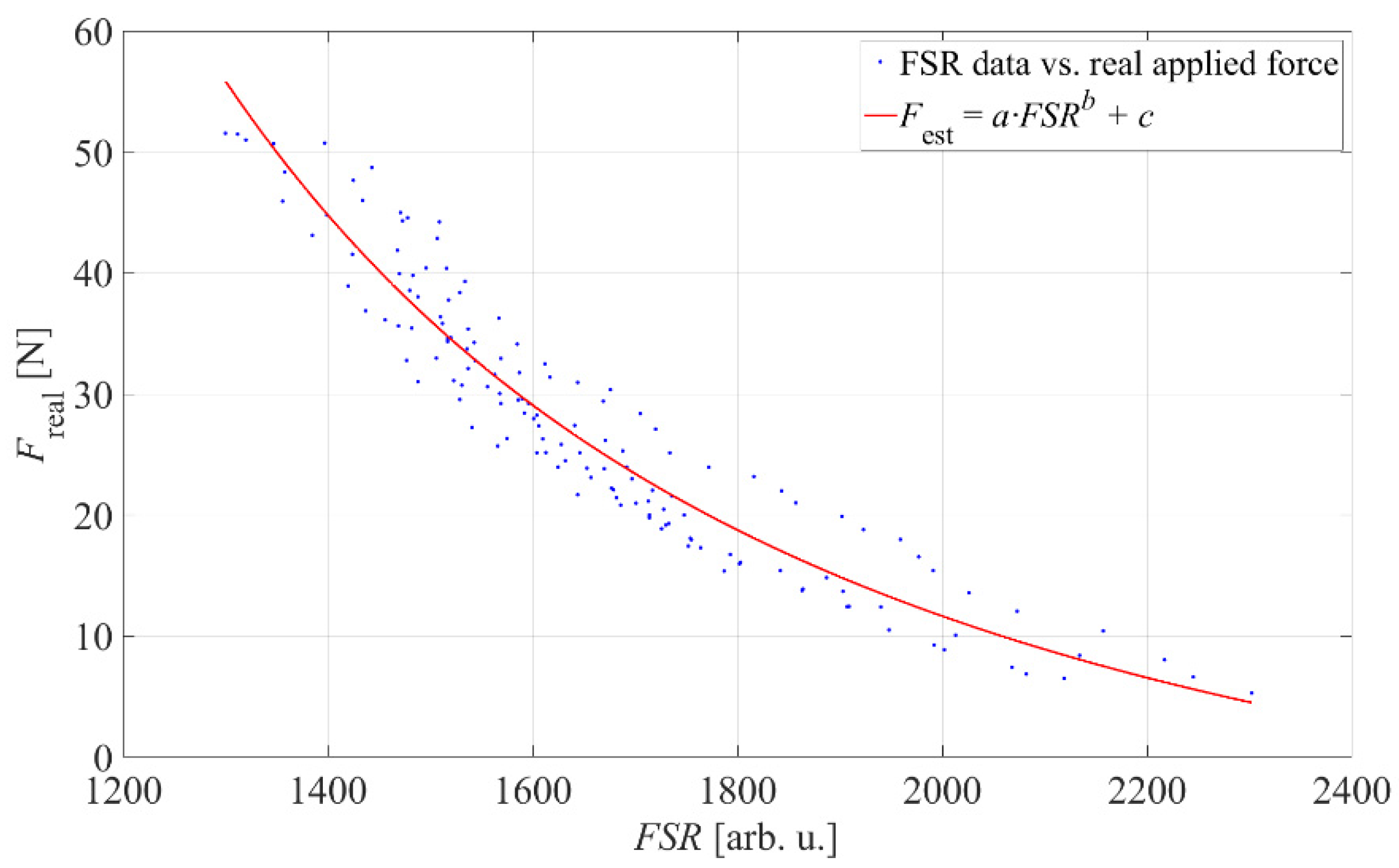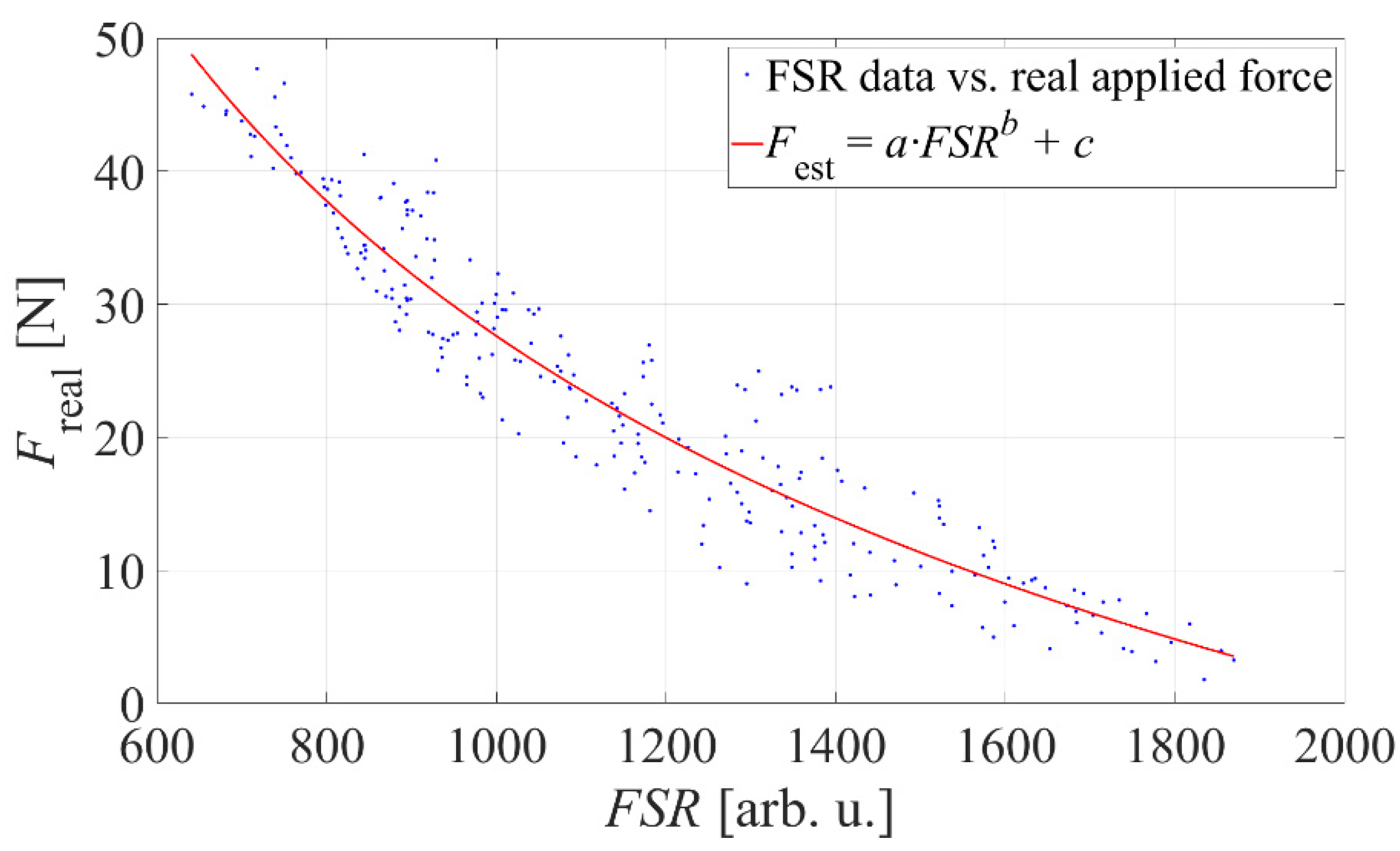 Here, Fest denotes the estimated force, while a, b, and c are the coefficients used for fitting the data. FSR is the raw output value from the control unit. Since these coefficients can change based on testing conditions, the system should be recalibrated when the monitored activity changes to ensure greater accuracy. Alternatively, using specific sensor caps is recommended to achieve a more uniform force distribution over the sensor’s surface.
