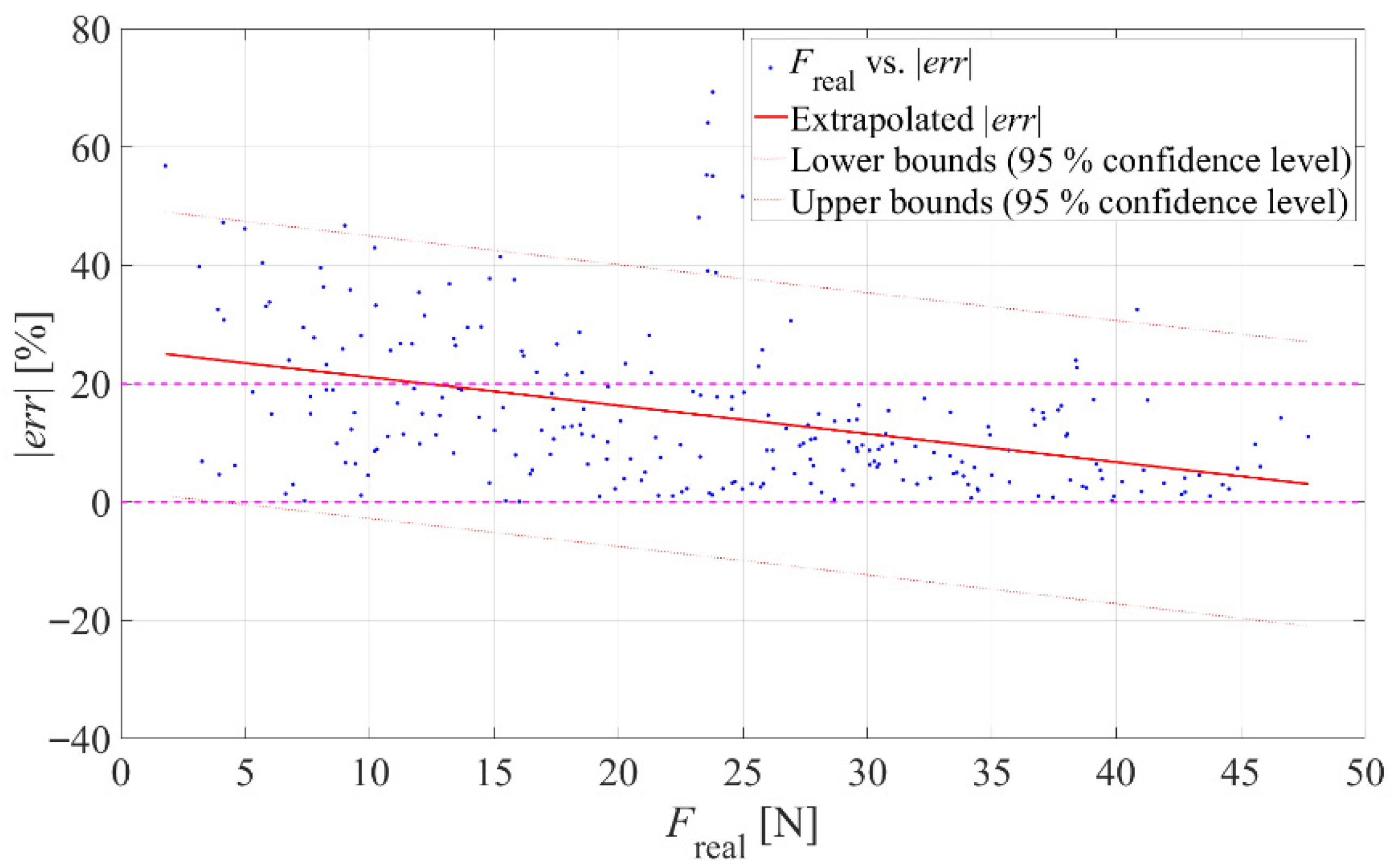 The accuracy of the force estimation is significantly influenced by the actual force being applied. When the real force is increased, the measurement error decreases, tending to fall below 20%.