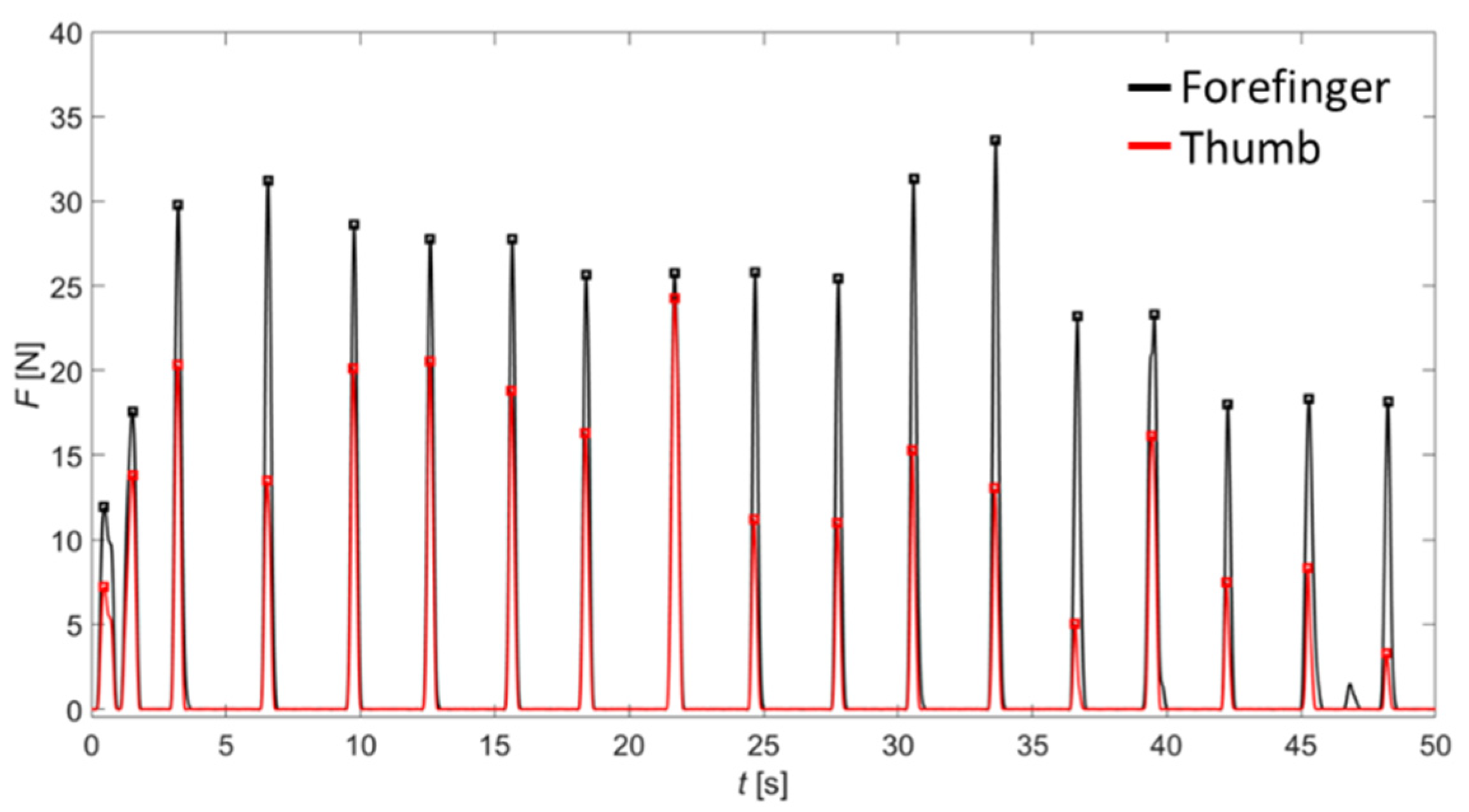 Based on the measured data, our algorithm was able to find 18 local maxima. Knowing the number of local maxima (n = 18) and the duration of the measurement (t = 50 s), we calculated the frequency of the workload-specific movements (pinch grips). The result was f = 21.6 movements per minute. Working at this frequency, the worker would perform 1296 movements, which resembles repetitive and monotonic activity where a part of the hand is subjected to a considerable load. Through observing this worker over time, we could investigate the long-term impact of this repetitive workload on his health. Therefore, the present device has significant potential for studying the local muscle load on a hand.