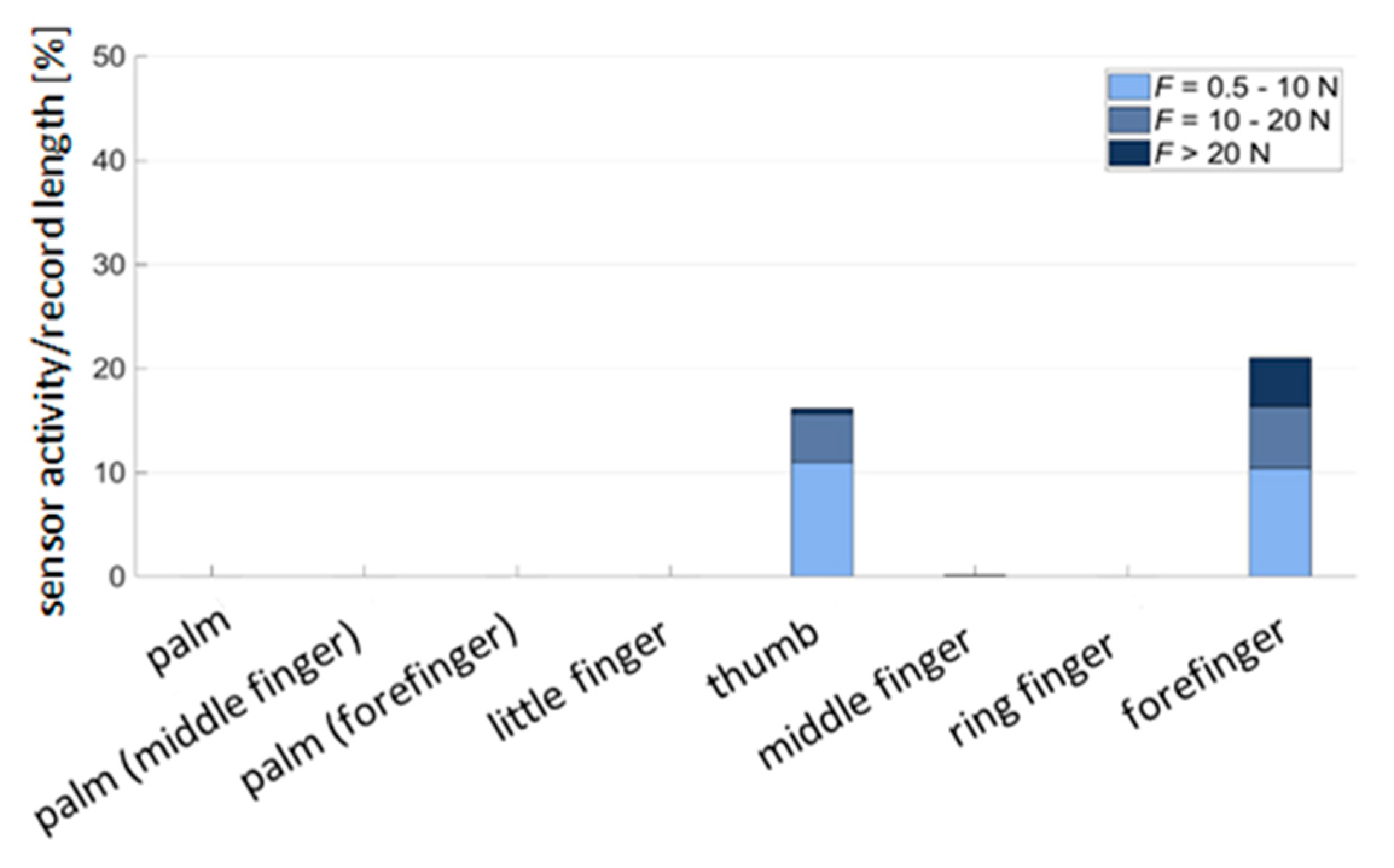 Figure 20 provides a visual representation of the proportion of single-sensor activity integrated over the entire period of recording, shown in seconds. The force intervals are distinguished using different colors. We can see that the force periods exerted by the tips of the fingers are not equal. It is clear from