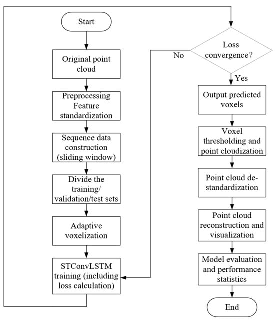 The pipeline steps are as follows: First, the global range of the dataset is analyzed, and the raw point cloud data are feature-normalized using a MinMaxScaler. Subsequently, temporal samples are constructed through a sliding-window mechanism. During the data-loading stage, adaptive voxelization based on K-nearest neighbor (KNN) density estimation accelerated by a KD-tree is performed on each time-step normalized point cloud to generate multi-resolution voxel representations. The encoder–processor–decoder STConvLSTM network with integrated CBAM3D attention modules is then employed for spatiotemporal modeling and prediction, while model parameters are optimized through a composite loss function combining structural perception loss and physical constraint loss. Finally, the predicted voxel fields are thresholded and converted back into point clouds, followed by inverse normalization to complete reconstruction and visualization evaluation.