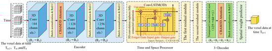 where denotes the output of the layer, and represents the 3D-transposed convolution operation. To stabilize gradients and strengthen feature reuse, dual residual connections are adopted around the ConvLSTM outputs and subsequent nonlinear transforms; a lightweight spatial weighting predictor further emphasizes key regions and suppresses over-prediction at noncritical locations. The network structure is as follows (Figure 4):