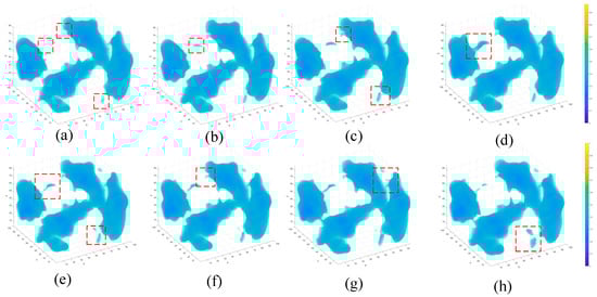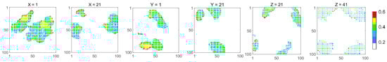 To visualize local prediction quality, cross-sections of error distribution at specific coordinates (X = 1, 21; Y = 1, 21; Z = 21, 41) were analyzed within the 100 × 100 × 100 voxel space (Figure 8). Most regions exhibit blue–green low-error zones, consistent with the high global similarity reported above. Red–yellow patches, representing larger deviations, appear mainly near complex geometric boundaries, implying potential improvement space for future boundary-refinement modules.