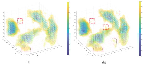 To further quantify prediction reliability, the spatial distribution of errors between the predicted and real data was analyzed (Figure 7). Most regions, especially the damage core, display low residuals close to zero, reflecting high overall accuracy and consistency with experimental data. The predicted results achieve an accuracy of 0.926, F1 = 0.947, and point cloud coverage = 0.975, indicating that nearly the entire damaged volume is captured. The structural similarity index (SSIM = 0.884) also supports excellent agreement in spatial topology.