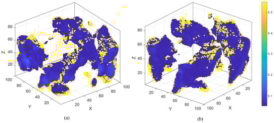 A more detailed inspection of the error patterns in Figure 6 and Figure 7 reveals that the regions of higher deviation—primarily located at multi-damage intersections and along complex boundary morphologies—are closely linked to two intrinsic limitations of the current framework. First, although the physics-constrained loss effectively promotes continuity and smoothness, its soft-regularization nature cannot fully capture the abrupt changes in stress gradients or crack bifurcation events occurring in highly unstable boundary regions. This limitation partly explains the localized overestimation at branching or merging zones. Second, despite the use of density-adaptive voxelization, extremely intricate damage geometries may still exceed the effective spatial resolution achievable by the voxel grid. Fine-scale curvature and high-frequency morphological variations can thus be partially smoothed, leading to boundary blurring and slight spatial offsets between the predicted and true damage fronts. These findings highlight that the major sources of error lie not in the temporal modeling but in the difficulty of representing highly complex spatial–mechanical interactions, particularly under strong heterogeneity. Future improvements may incorporate curvature-aware constraints or multi-scale residual voxel refinement to mitigate these effects.