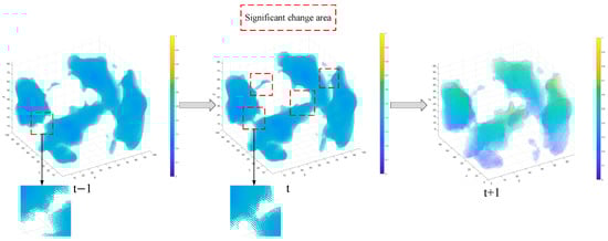 The model was also tested for multi-step temporal reasoning: using two historical time frames (t − 1, t) to predict the next one (t + 1). As shown in Figure 9, the predicted expansion trend matches the pattern observed in prior steps, with a spatial structure similarity exceeding 90%. Even without direct ground-truth comparison at this step, the consistency of propagation confirms that the model has learned stable spatiotemporal dynamics rather than memorizing static frames.