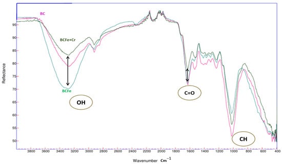 The incorporation of iron chloride into the BC biomass has been shown to induce stretching of the hydroxyl group (OH), resulting in the formation of FeOOH groups [24]. This modification of the cellulose has been demonstrated. It has also been observed that the band of the (CH) group underwent a stretching phenomenon at 1032. This transformation in the biomass ostensibly favors the cation exchange process with heavy metals among the Cr(VI) [23]. Following the experimental Cr(VI) adsorption process, significant alterations in its stretching levels were observed during FTIR tests. A significant alteration in the hydroxyl group (OH) was discerned following the chemisorption process of the (OH) group [36]. A proportion of the hydroxyl groups were forfeited during the characterization process due to the presence of Cr(VI) within the biomass, which was predominantly accountable for the adsorption of this heavy metal. This is attributable to the pronounced vibrations of the O-Cr.
