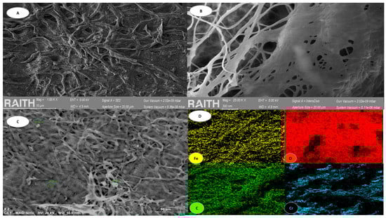 Uniform filaments and fibrillation can be observed due to their homogeneity, creating three-dimensional structures and reaching nanofiber levels, which facilitates heavy metal adsorption processes [46,47] (Figure 3A–C). Furthermore, after the addition of iron chloride and subsequent Cr(VI) chemisorption, a sample of this biomass was obtained at its maximum Cr(VI) concentration, which was used during the experiment to perform an EDS mapping, which revealed the distribution of the elements oxygen (O), carbon (C), iron (Fe) and chromium (Cr) along the three-dimensional structure (Figure 3C). In addition to the previous figure, Figure 4 is presented, showing the different elements of the sample after iron adhesion and Cr(VI) incorporation.