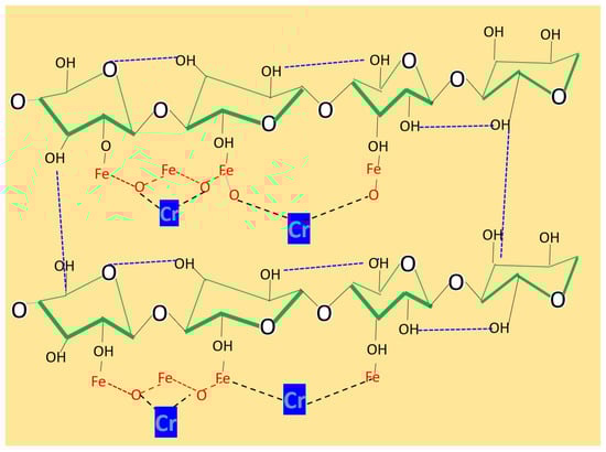 As demonstrated in Figure 5, a synopsis of the physicochemical characteristics of bacterial cellulose biomass in conjunction with iron chloride is provided. The utilization of iron chloride (Fe(III)) in conjunction with cellulose has been the subject of numerous investigations, with the objective of enhancing the adsorption capacity of heavy metals [24]. Iron (III) is an element that, in the presence of water, oxidizes cellulose, forming iron hydroxides (FeOOH); these oxidation processes are imperative in the elimination of contaminants, such as heavy metals [48,49]. In the present study, Figure 6 shows the observed removal process of Cr(VI) from effluents by bacterial cellulose biomass with iron. Similar ion-exchange and complexation patterns between H+ ions from the biomass and oxygen-containing metal species were observed for Cu2+, Ni2+, Co2+ and Fe3+ [50,51,52].