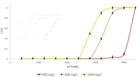 As illustrated in Figure 7, Cr(VI) removal rates varied with three different initial chromium concentrations. The concentrations of the substance investigated were 400 mg/L, 600 mg/L and 1000 mg/L. It is important to note that all the aforementioned processes were performed in triplicate and were based on the arithmetic mean. Final concentrations were consistently below 0.1 mg/L, indicating effective chromium removal from the water. Consequently, under all three initial conditions, the curves did not develop until biomass saturation, at which point samples above 500 mL were collected at the column outlet.