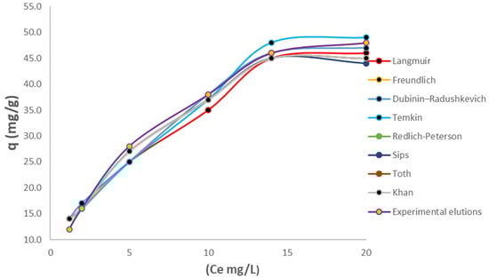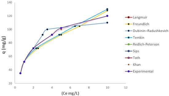 Different types of isotherms were studied to establish the dynamics and distribution of Cr(VI) on the new adsorbent biomass model. Various studies have determined that bacterial cellulose is a homogeneous monolayer [57,58] due to its almost perfect glucose distribution, forming three-dimensional networks of this monosaccharide. However, when iron chloride is present in its biochemical structure, it is best to determine the isothermal distribution under which it adapts to this process. Generally, the distribution of contaminants, especially heavy metals, is governed by quasi-probabilistic distributions, in which a homogeneous layer is present, resulting in a Gaussian-type distribution. Figure 8 shows the relationship between the adsorption capacity q(mg/g) vs. the equilibrium concentration, along with other isotherm curves. These curves show the behavior and the experimental data fit some, but not others.