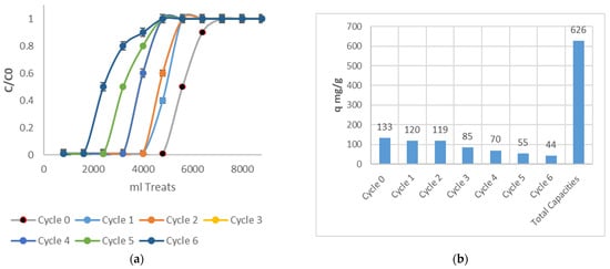 Adsorption capacities in different cycles’ adsorption processes. (a) shows the different cycles and (b) shows the adsorption capacity of each cycle, along with a summation of all adsorption capacities.