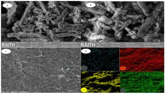 BC analysis. (A) shows SEM morphology at 10 µm. (B) shows SEM morphology at 300 µm. (C) shows SEM morphology at 50 µm. (D) shows EDS mapping that revealed distribution of elements in the biomass.