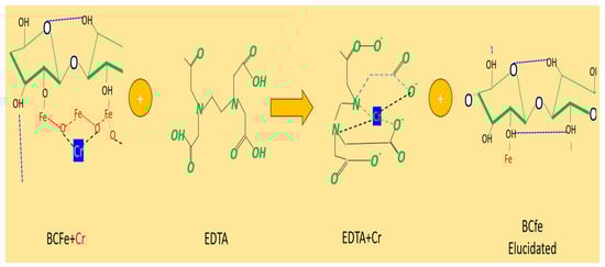 EDS evaluation shows the characterization of the BCFe biomass after 6 cycles of EDTA elutions and subsequent Cr(VI) adsorption treatment. Compared to Table 1, there is a decrease in the amount of iron in the sample. Also, a significant reduction in Cr(VI) can be seen due to the loss of biomass adsorption processes due to outgassing caused by the elutions. Due to the composition of EDTA, C10H16N2O8, there was a presence of nitrogen and an increase in the characterization of the carbon and oxygen sample. Figure 12 shows a representation of the EDTA elution process.