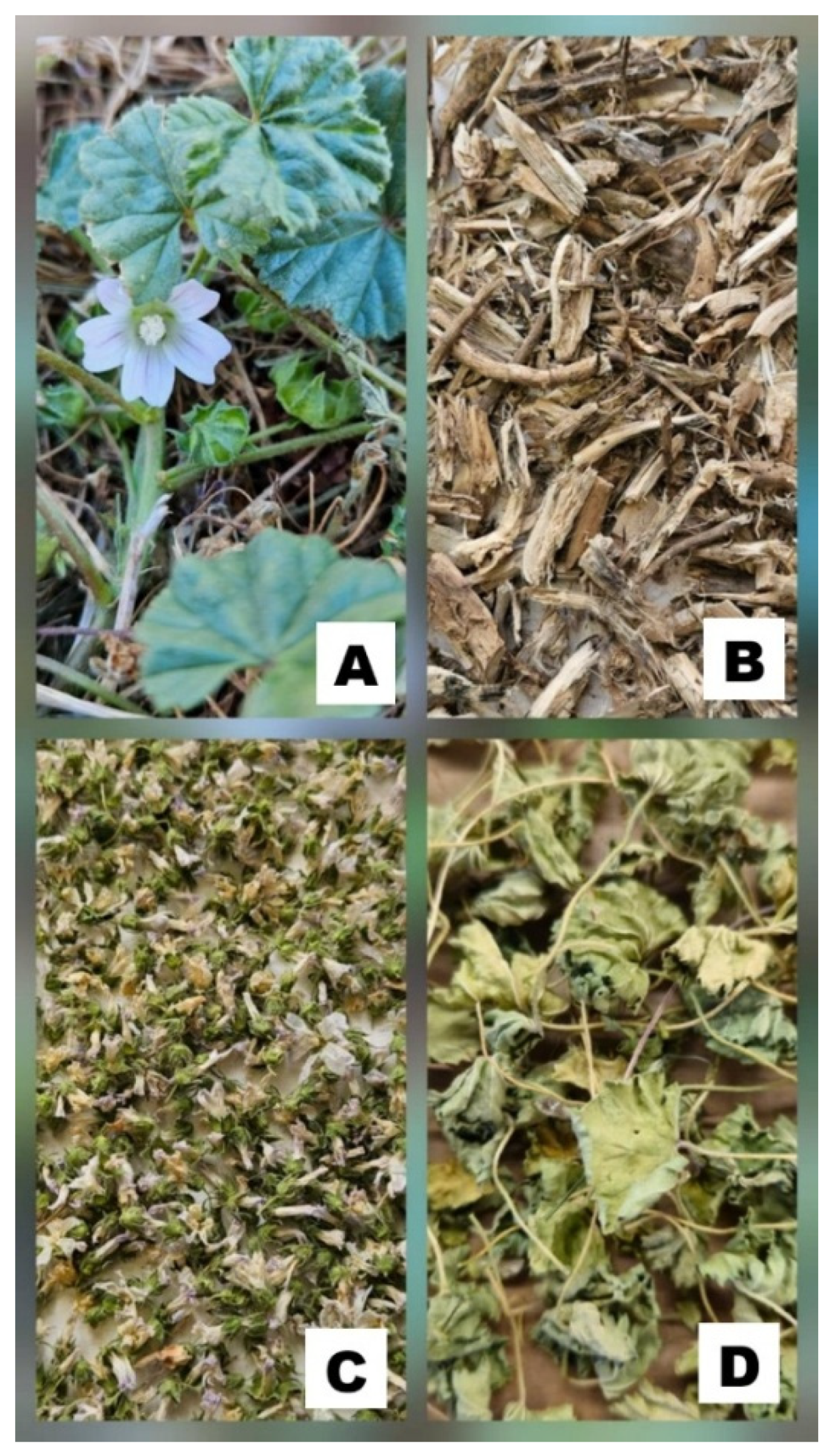 - Batiha, G.E.; Tene, S.T.; Teibo, J.O.; Shaheen, H.M.; Oluwatoba, O.S.; Teibo, T.K.A.; Al-Kuraishy, H.M.; Al-Garbee, A.L.; Alexiou, A.; Papadakis, M. The phytochemical profiling, pharmacological activities, and safety of Malva sylvestris: A review. Naunyn-Schmiedeberg’s Arch. Pharmacol. 2023, 396, 421–440. [Google Scholar] [CrossRef]
