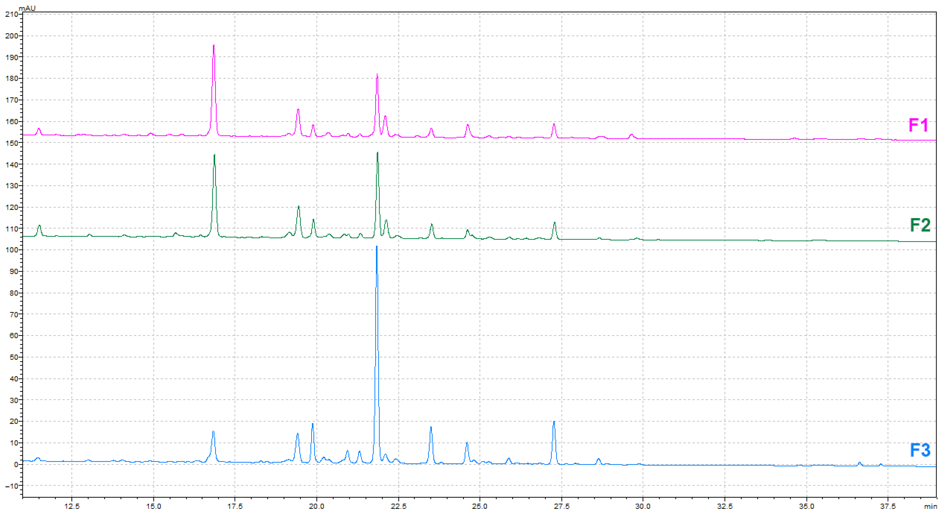 | 14 | 21.85 | Flavonoid triglucoside II | 755 | 264, 347 | + | + | + | − | − | − | − | − | − | |