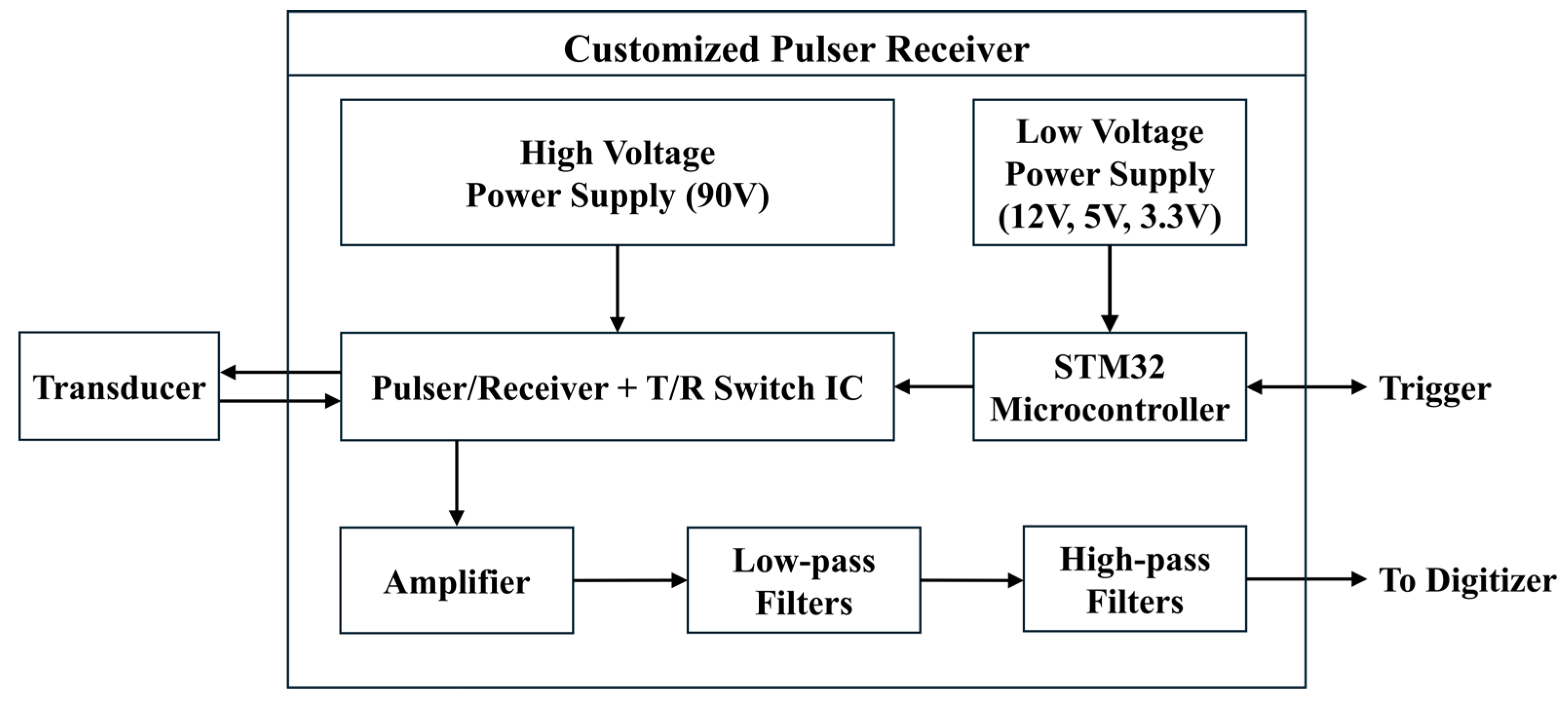 - Bui, N.T.; Nguyen, T.M.T.; Dinh, T.T.N.; Bui, Q.C.; Vo, T.H.; Phan, D.T.; Park, S.; Choi, J.; Kang, Y.-H.; Kim, B.-G.; et al. Design of a Multichannel Pulser/Receiver and Optimized Damping Resistor for High-Frequency Transducer Applied to SAM System. Appl. Sci. 2020, 10, 8388. [Google Scholar] [CrossRef]