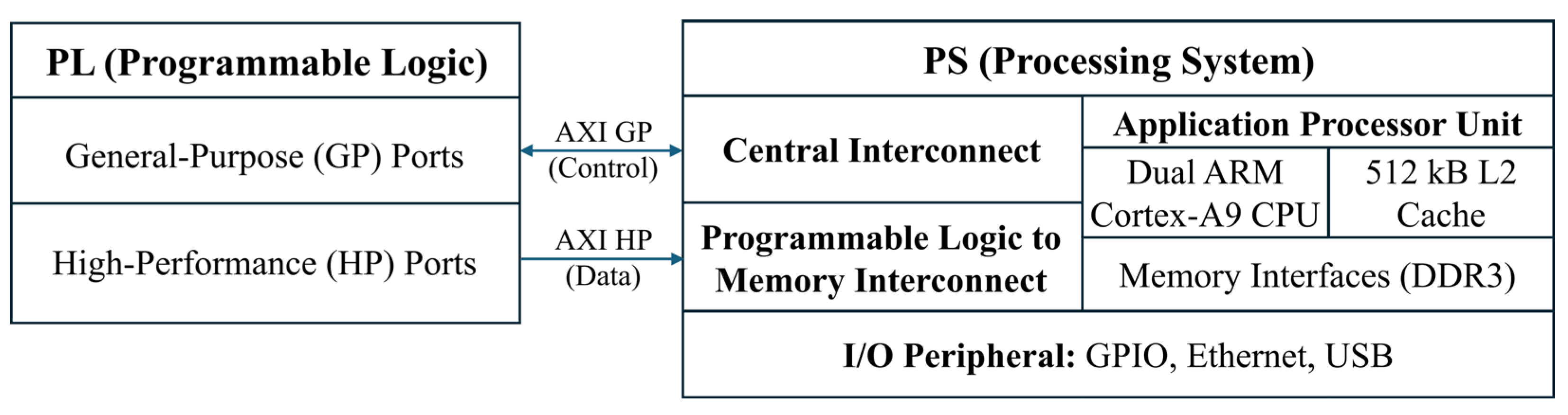 | FPGA—Programmable Logic (PL) | High-speed ADC data capture; deserialization; buffering; hardware-level synchronization. | HDL/Vivado design for ADC interfacing, FIFO management, trigger alignment, and high-speed parallel processing. |
