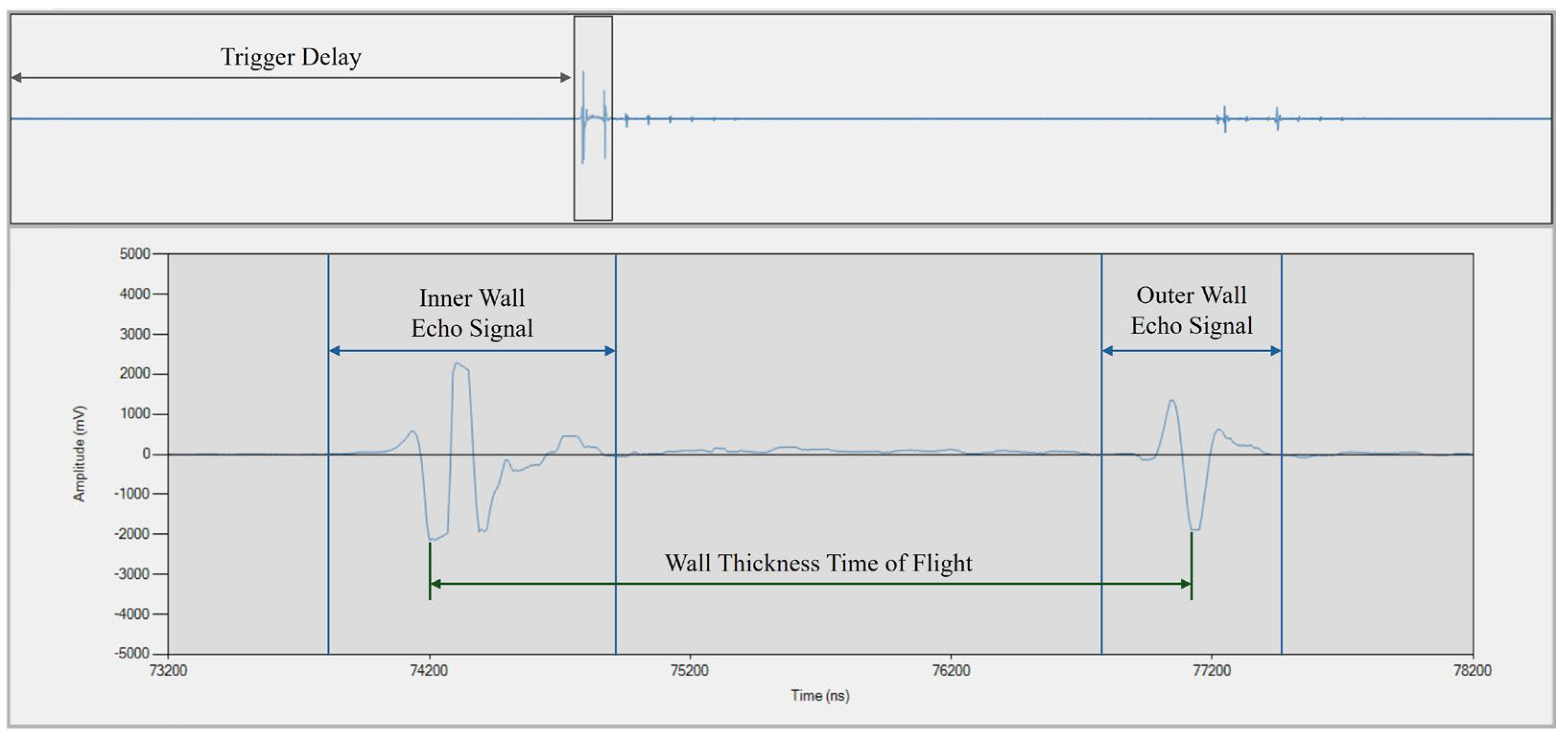 - The system achieves smooth A-scan waveforms for both the front and back walls. The wall-thickness accuracy within ±2.5% demonstrates a reliable measurement performance.