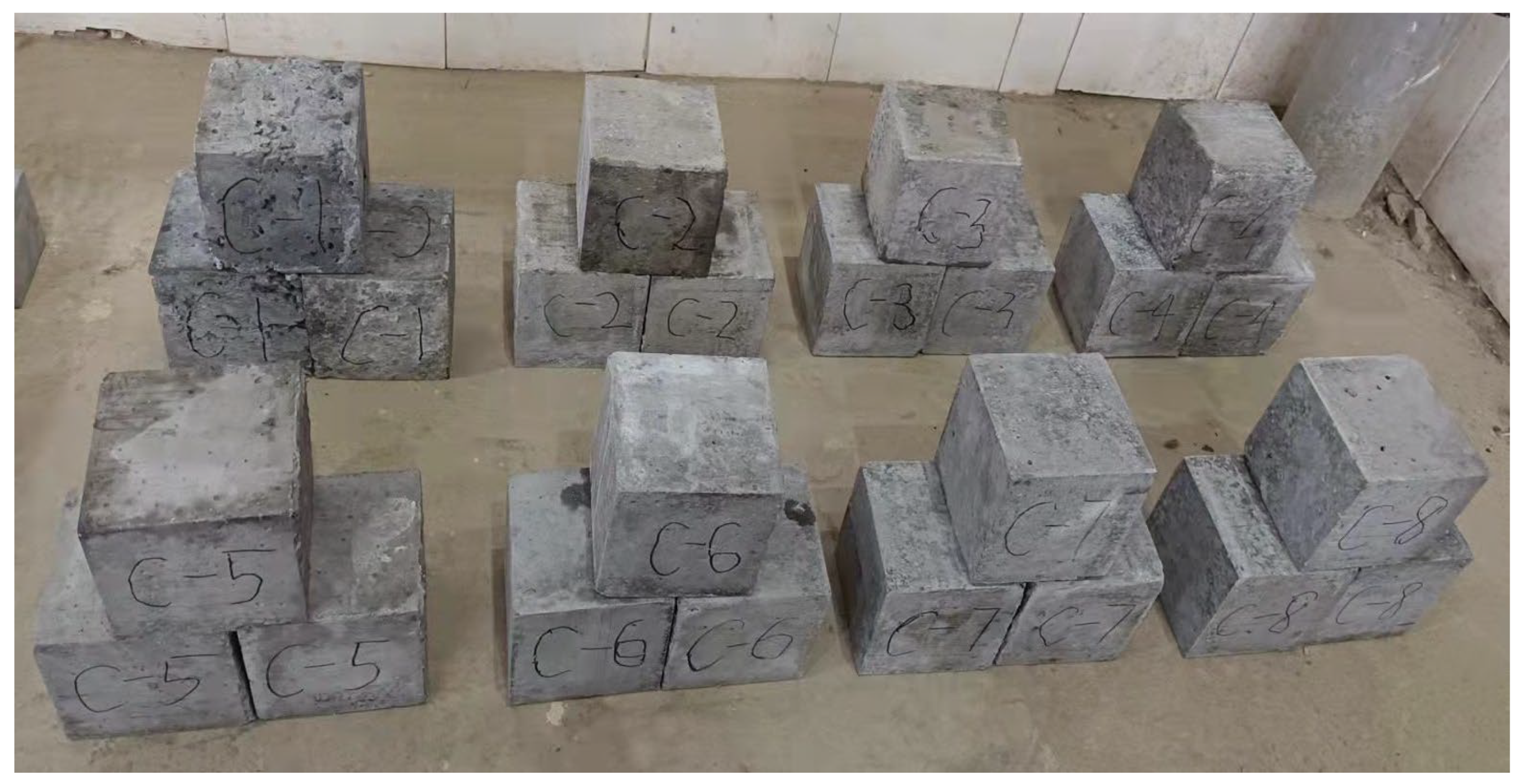 All specimens were cured for 28 days under controlled environmental conditions, with temperature maintained at 20 ± 2 °C and relative humidity kept above 95%. Compressive strength was used as the primary evaluation metric. The cured concrete specimens, including the PCC specimens, are presented in