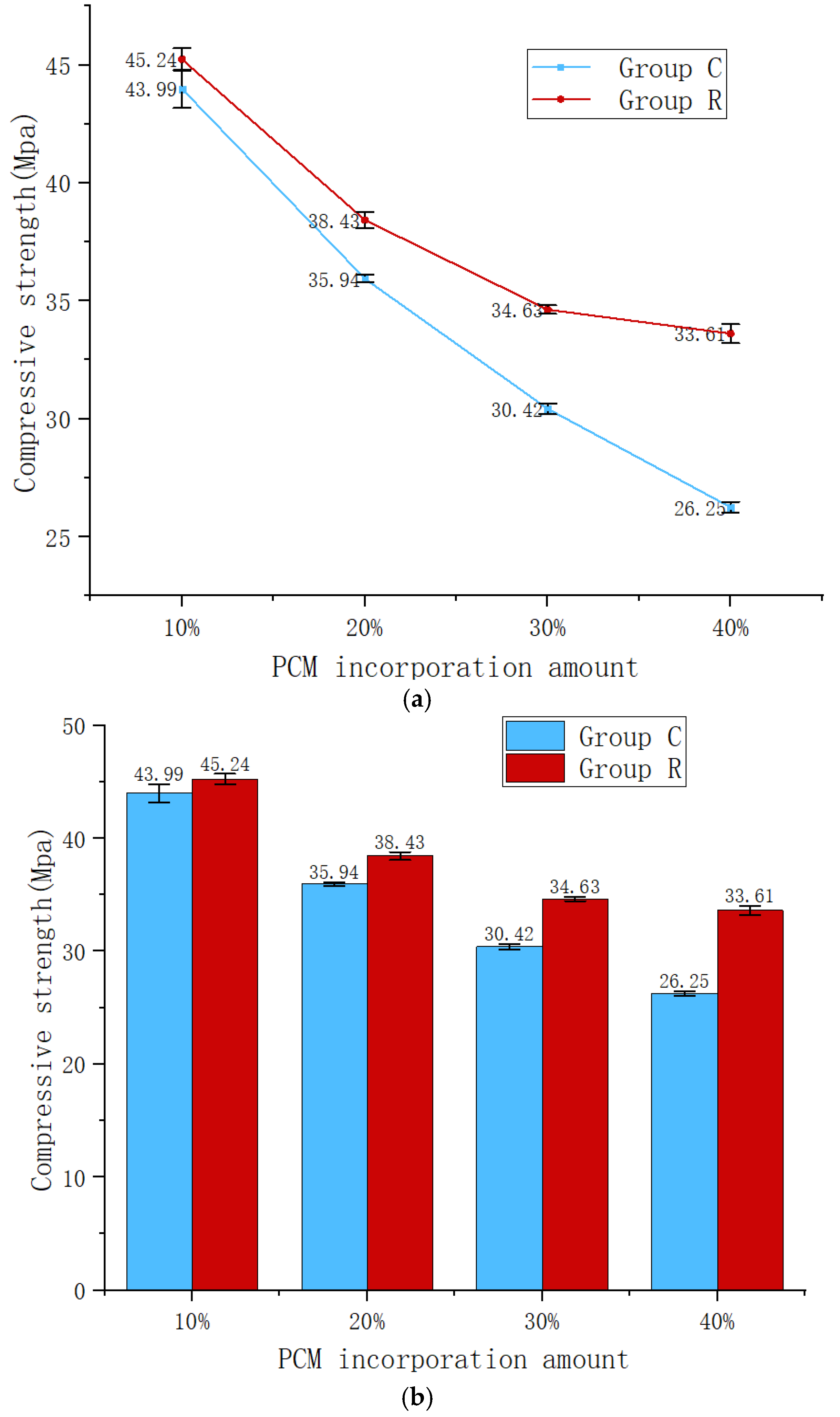 Figure 5a, the compressive strength of the reinforced group R consistently surpassed that of the control group C. As the PCM dosage increased, the compressive strength of group C exhibited a nearly linear decreasing trend, with a more pronounced rate of strength reduction. In contrast, for group R, the decline in strength was steeper at lower PCM dosages but gradually leveled off as the dosage increased. With increasing PCM content, the reinforcing effect on the compressive strength of PCC became increasingly evident.