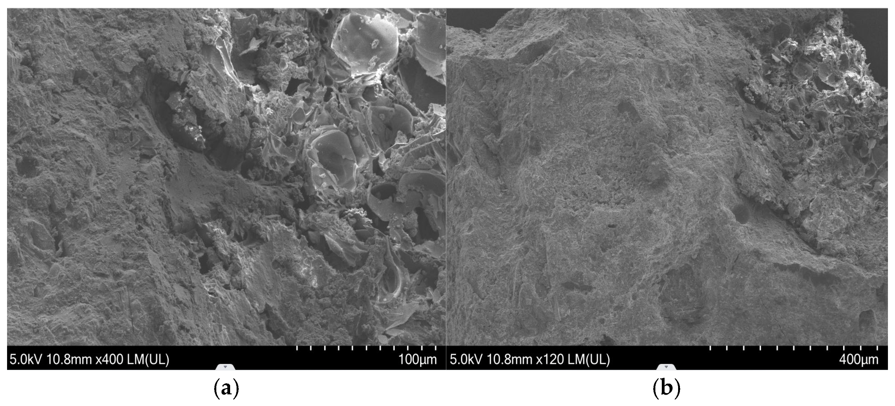 Figure 7a, the SEM image of the PCC in Group C reveals numerous pores, including residual voids unfilled with PA and inherent pores within the concrete matrix. In contrast,