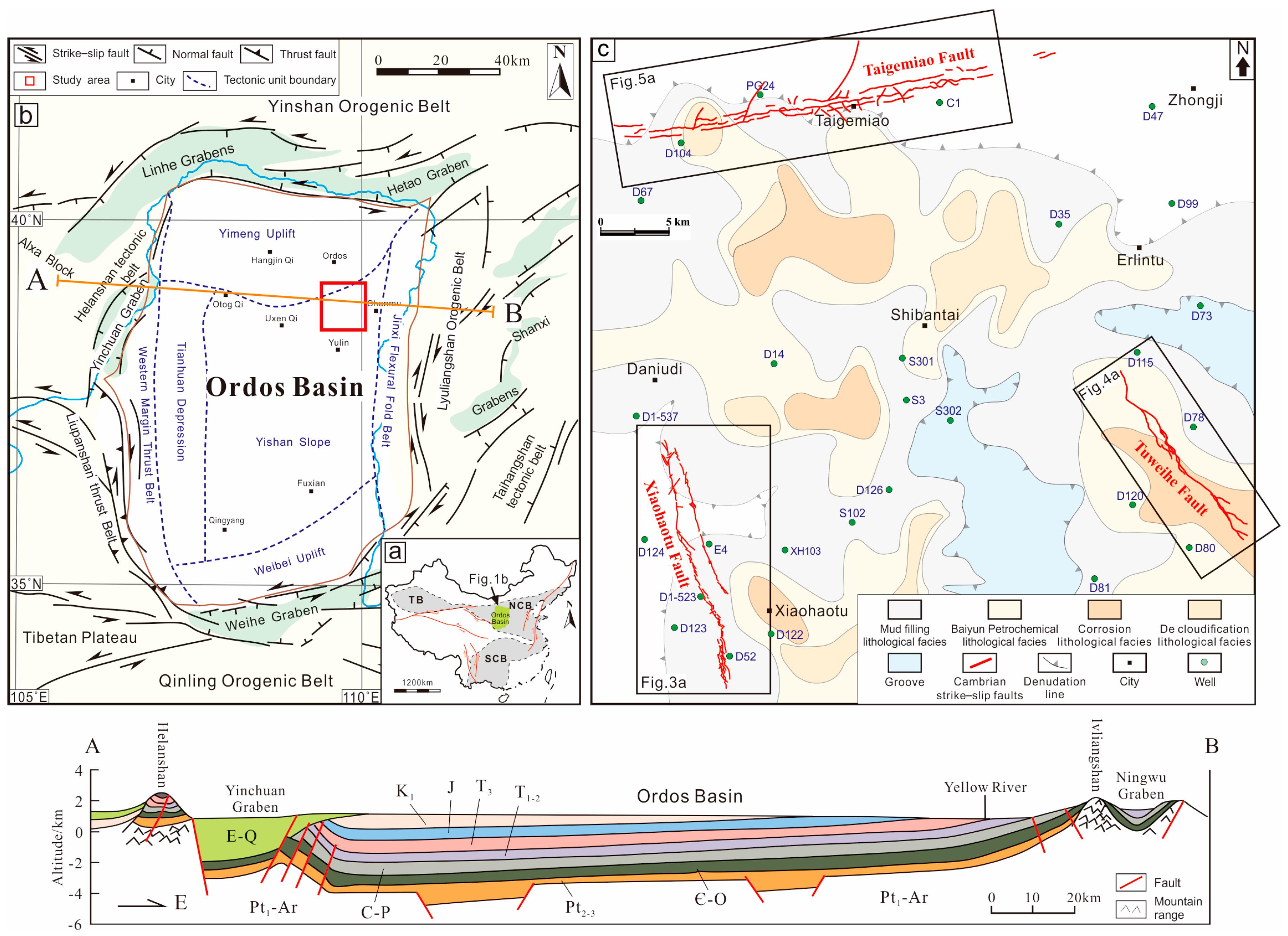 - Xu, W.; Deng, H.C.; Lei, T.; Fu, M.Y.; He, J.H.; Wu, D.; Wang, X.; Lan, H.X. Control of different faults on supergene karst in the Majiagou Formation of Daniudi Gas Field, northeastern Ordos Basin. Nat. Gas Geosci. 2023, 34, 431–444. (In Chinese) [Google Scholar]