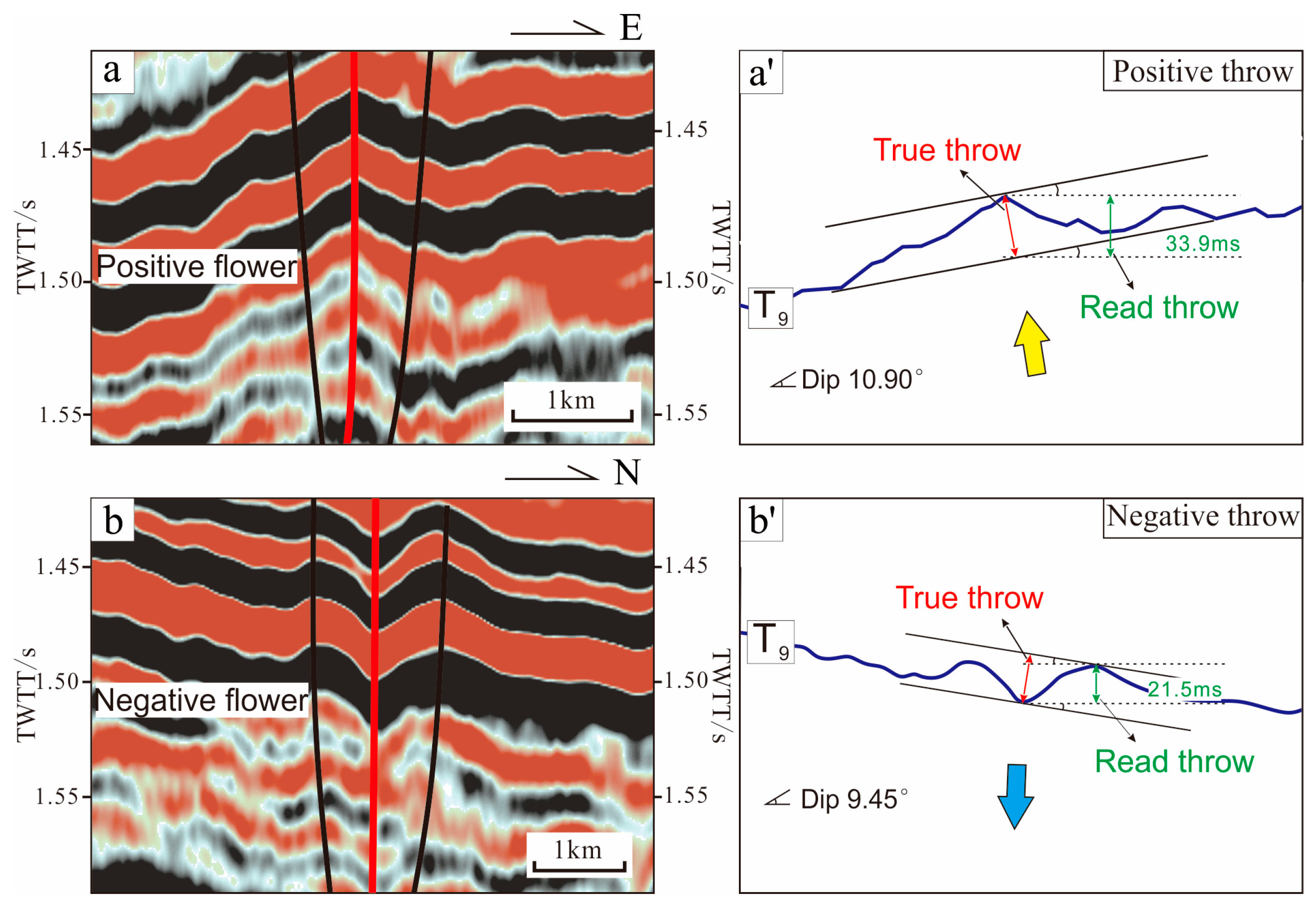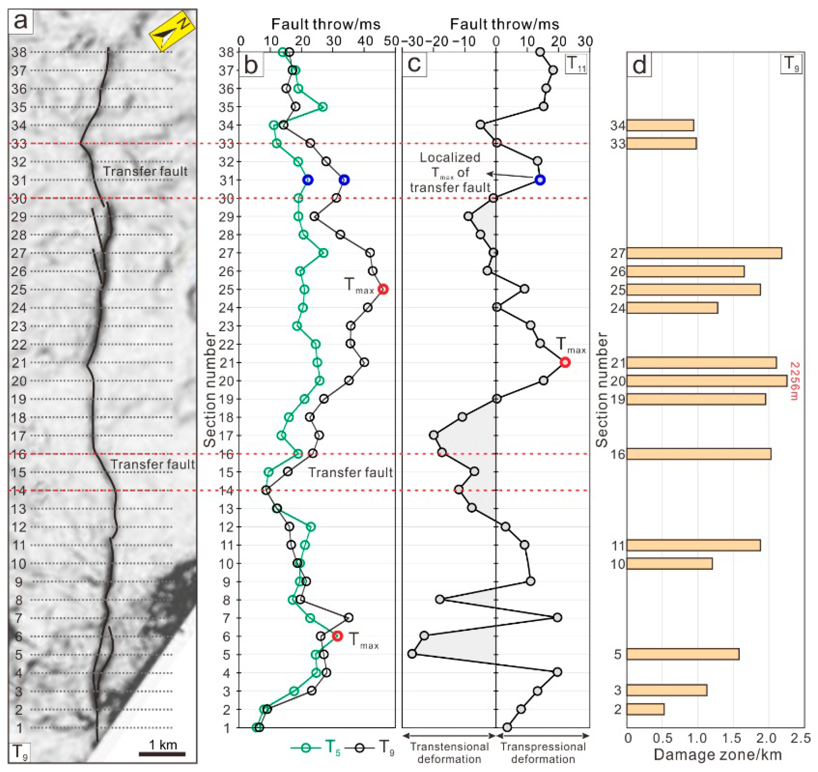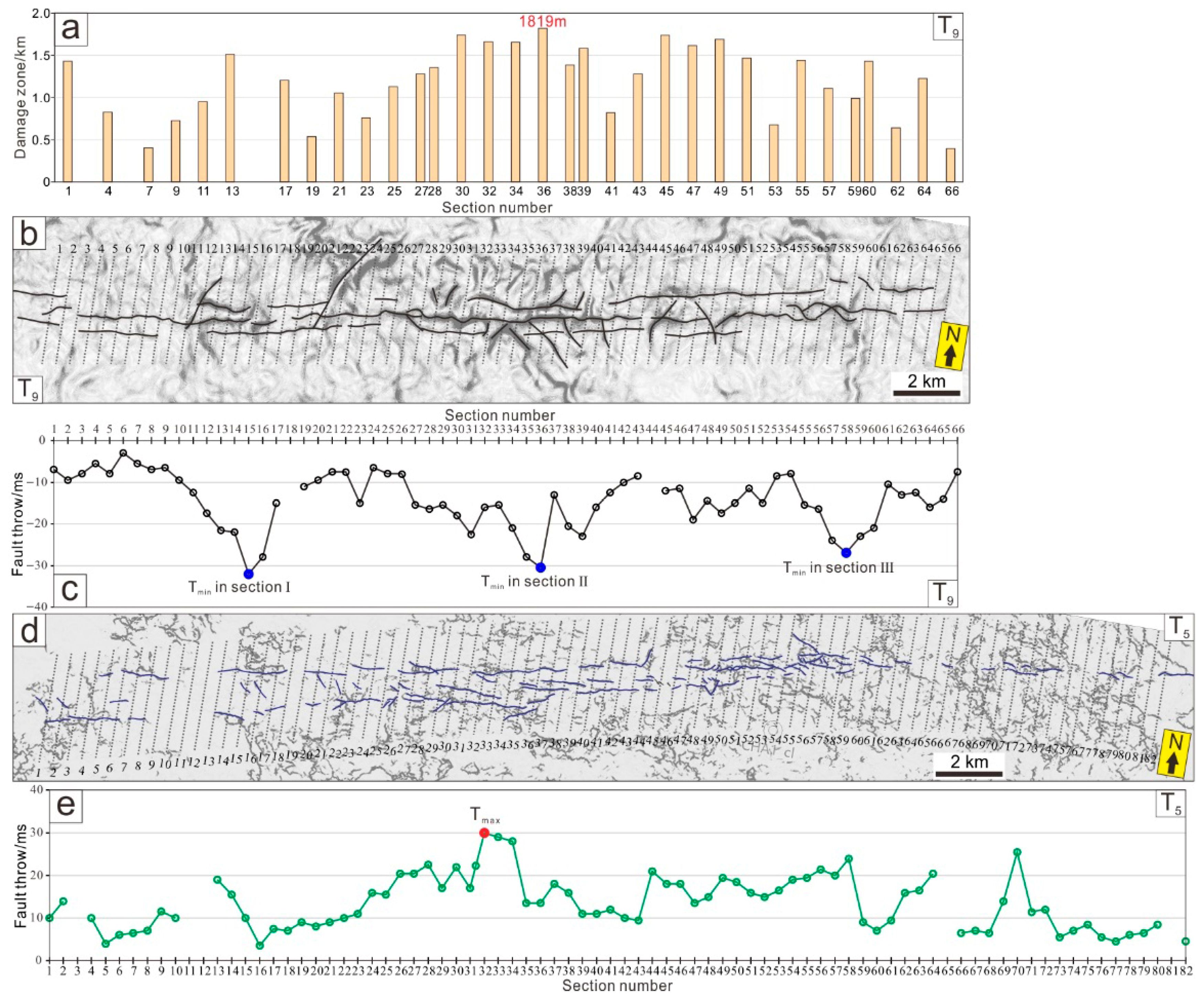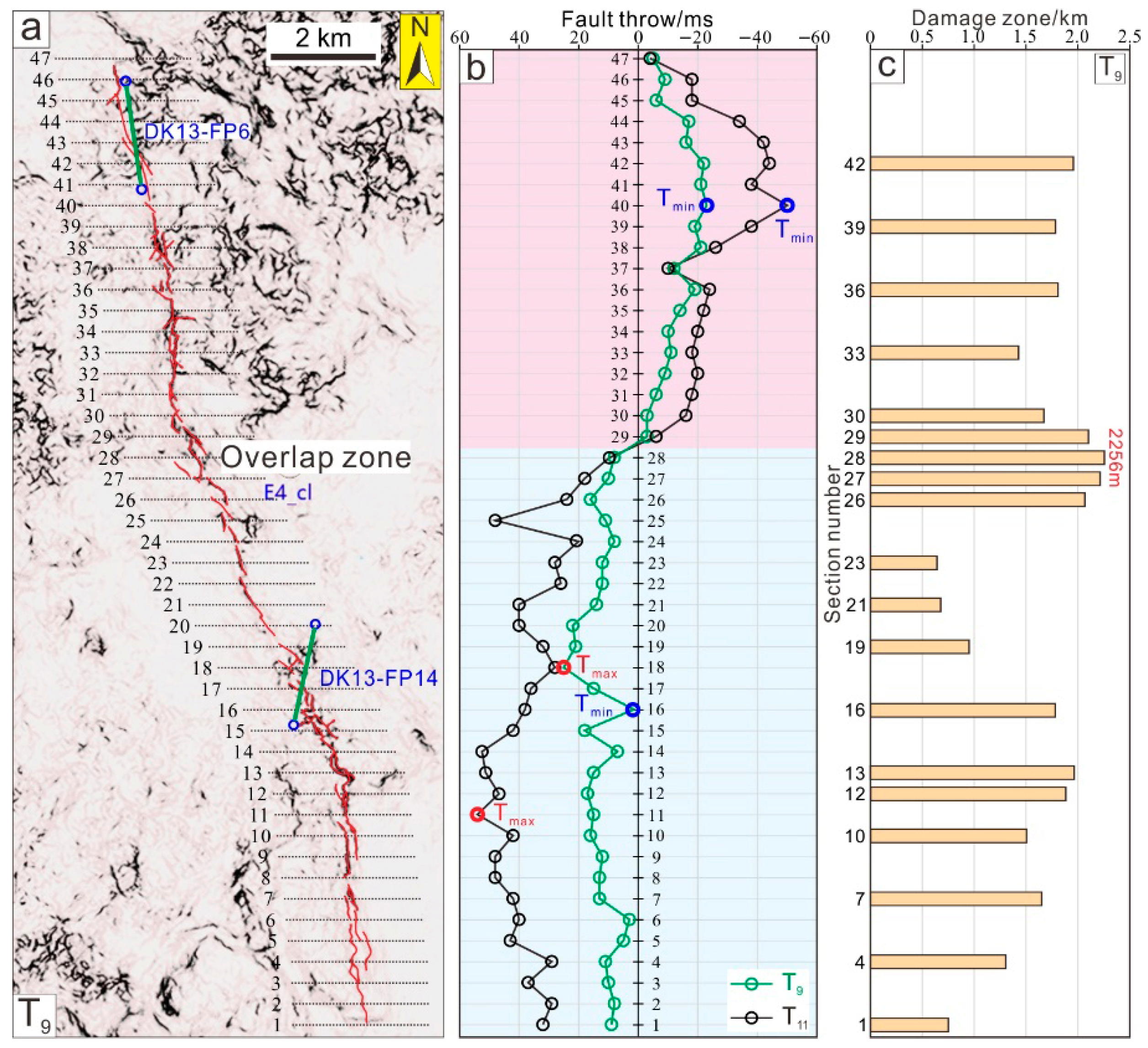 - Along-strike throw of the strike–slip fault zone in the Daniudi Block exhibits a characteristic pattern, being highest centrally and decreasing toward both tips, with minor variation in the location of the maximum value. The development of fault overlay zones and secondary faults significantly enlarges the width of fault damage zone.