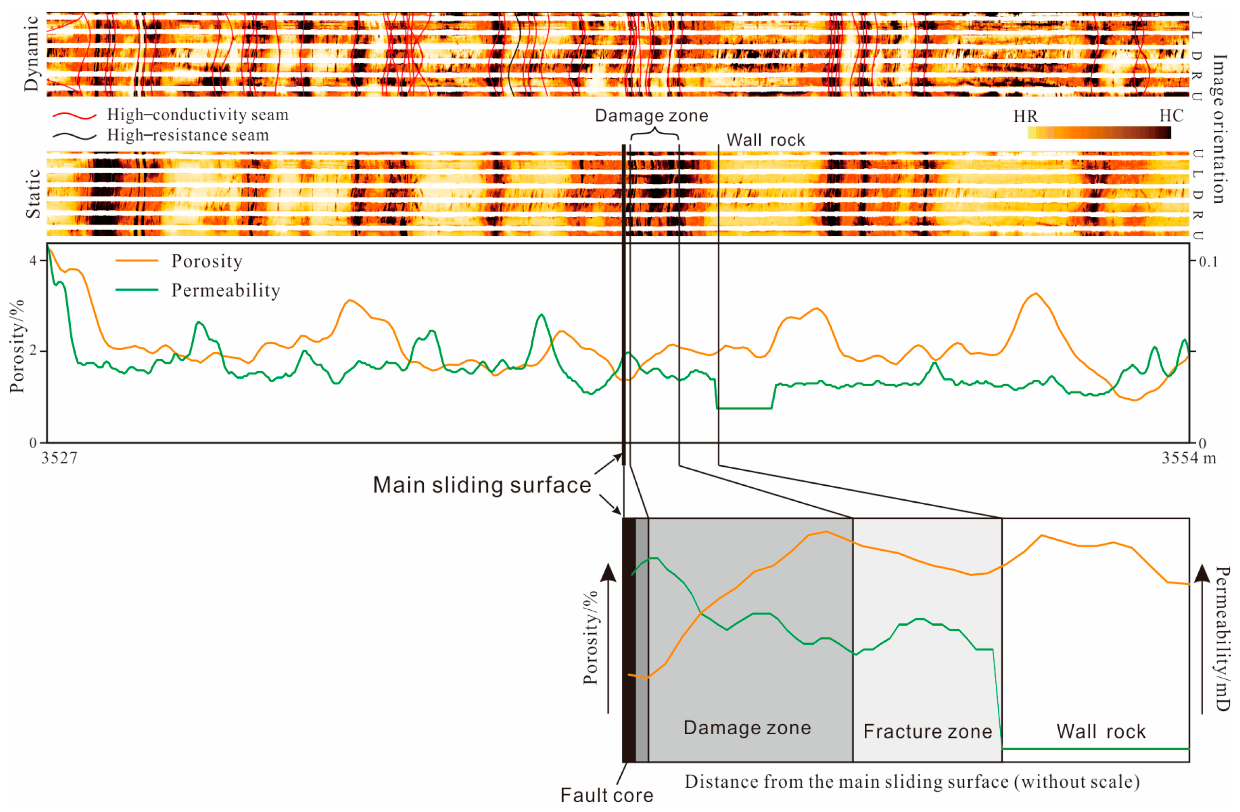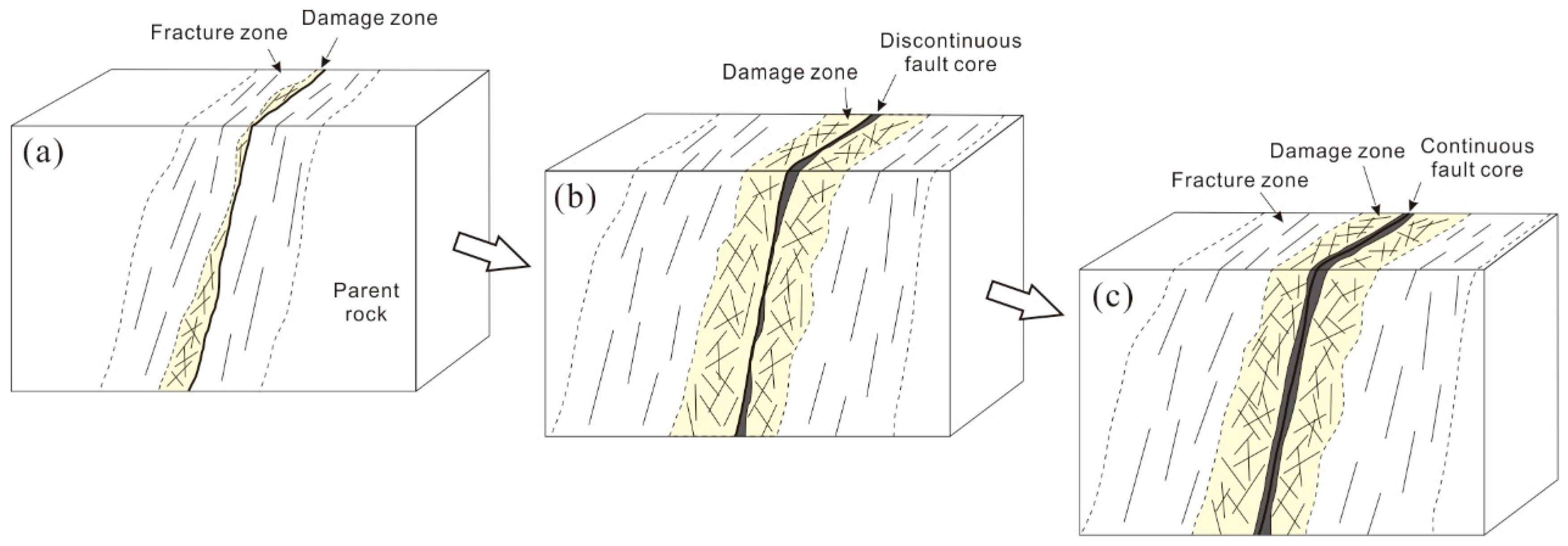 - As the displacement increases, the width of the damage zone expands notably, and the originally discontinuous fault core gradually connects. The fault core is dominated by high-permeability fault breccia, surrounded by a damage zone. The density of fractures decreases away from the damage zone, which is the fracture zone. The fault undergoes shear fracturing, forming a typical ternary structure.