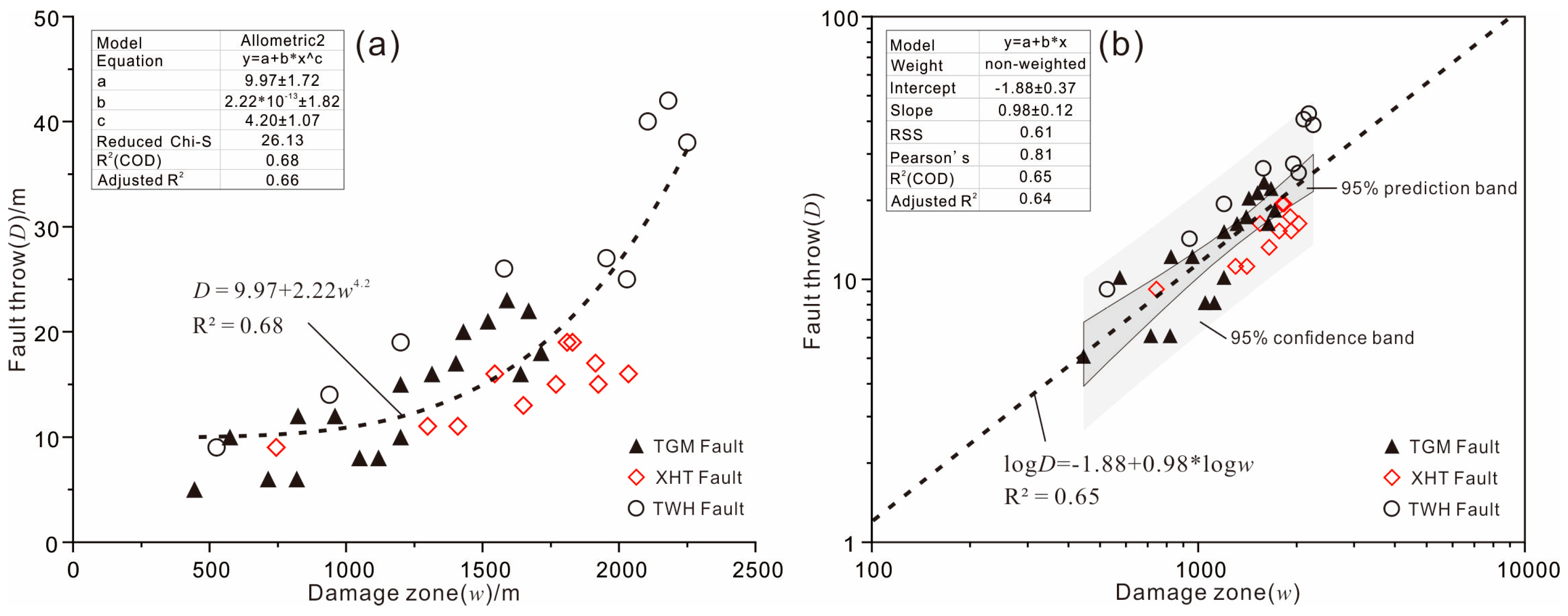 - A positive power–law correlation exists between fault throw and damage zone width. This relationship allows the damage zone width of strike–slip faults in the study area to be roughly predicted from throw data, enabling mutual verification between these two parameters in future work.