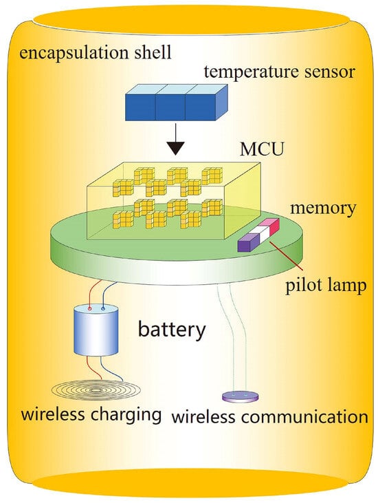 Compared with other downhole microchips, the new-generation microchip developed in this study exhibits a significant improvement in performance parameters: specifically, its maximum operating temperature is increased to 160 °C (in contrast to approximately 100–120 °C for other products [9,10]), and its measurement accuracy reaches ±0.5 °C (versus ±1 °C for other products [11]). Incorporating an entirely new resin encapsulation technology and circuit design, the microchip features a cylindrical structure, which effectively addresses the heat accumulation issue prevalent in other products. Wireless design is fully adopted for both charging and data transmission, replacing the conventional I/O port design and thereby enhancing the overall sealing performance of the device. Additionally, an indicator is integrated into the microchip to identify the operational status of the microchip system through color cues.