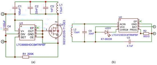 Schematics of microchip charging circuit. (a) wireless charging signal conversion circuit, (b) wireless charging management and battery charging circuit.