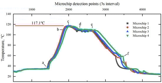 Figure 5 shows a comparison between the measured data from three microchips and the measured data from the temperature probe of the high-temperature and high-pressure consistometer. To quantitatively evaluate the measurement deviation of the microchips under high-temperature conditions, statistical analysis was conducted on the maximum temperatures measured by the three microchips, with the consistometer temperature probe serving as the reference standard. The maximum temperature recorded by the consistometer probe was 164.0 °C, while the maximum readings of the three microchips were 163.94 °C, 164.56 °C, and 164.10 °C, respectively, with deviations from the reference standard of −0.06 °C, +0.56 °C, and +0.10 °C in sequence. The average value of the peak temperatures of the three microchips was 164.2 °C, which was only 0.2 °C higher than the reference standard (with a relative error of approximately 0.12%). This indicates that the microchips can still maintain good consistency with the consistometer temperature probe in the high-temperature range above 160 °C, meeting the accuracy requirements for high-temperature wellbore temperature measurement.