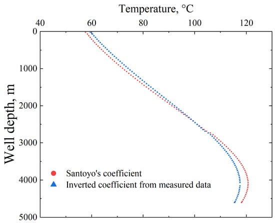 The maximum circulating temperature of the wellbore measured by the microchip is 117.1 °C, while the temperature calculated by the model proposed in this study is 120.7 °C, which is 3.6 °C higher than the measured value. The average outlet temperature measured by the temperature sensor installed at the wellhead is 60.7 °C, and the model-calculated temperature is 57.6 °C, approximately 3.1 °C lower. Through analysis, it is found that this type of temperature calculation error is mainly caused by the excessively high value of the convective heat transfer coefficient between the formation and the annulus fluid. The convective heat transfer coefficient adopted in this study’s model is based on the calculation method recommended by Santoyo [27]. On this basis, combined with the actual microchip measurement values, the calculated value of the convective heat transfer coefficient between the formation and the annulus fluid is inverted and optimized, with the results illustrated in Figure 9.