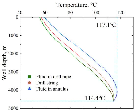After reaming the wellbore to the bottomhole, circulation for sand cleaning was conducted at a displacement of 31.2 L/s for 2 h and 40 min. The calculated results of the wellbore temperature distribution are shown in Figure 10. Wellbore temperature encompasses the fluid within the drill pipe, the drill string, and the annular fluid. In the radial direction, the annular fluid exhibits the highest temperature, followed by the drill string, with the lowest temperature observed in the internal pipe fluid. In the longitudinal direction, the model assumes equal temperatures for the three regions at the bottomhole; moving upward from the bottom, temperature differences gradually increase with decreasing well depth in the lower wellbore, then diminish again in the upper wellbore. At the end of drilling fluid circulation, the bottomhole temperature measures 114.4 °C, with a hotspot temperature of 117.1 °C occurring at a well depth of 4066 m.