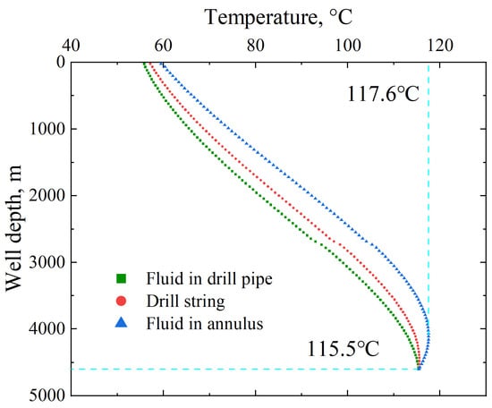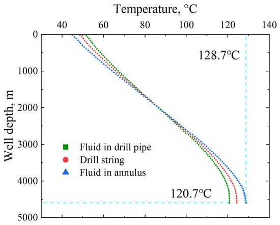 Subsequent to the cessation of circulation, the process of wellbore reaming persisted, accompanied by the maintenance of drilling fluid in a static state for a duration of two hours and 20 min. The calculations pertaining to the temperature changes within the wellbore are illustrated in Figure 11. During the static period, the exchange of heat within the wellbore was predominantly governed by radial heat conduction, with axial heat conduction playing a supplementary role. The phenomenon of spontaneous heat transfer from high-temperature to low-temperature objects is driven by radial temperature differences. A comparison of Figure 10 with Figure 11 reveals that, in the longitudinal direction of well depth, the bottomhole exhibited an increase in temperature, the middle interval demonstrated negligible temperature fluctuations, and the wellhead experienced a decrease in temperature. At the bottomhole, the annular fluid, drill string, and fluid within the drill pipe exhibit a distinct temperature gradient.
