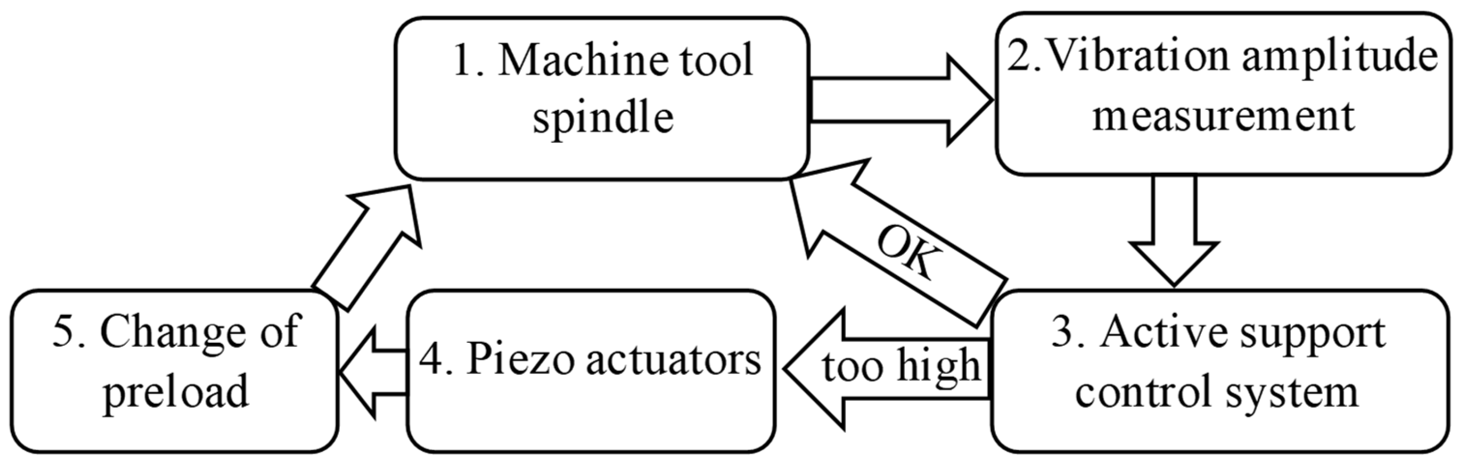 7]. These types of solutions allow the same machine to be used for various types of machining and to operate within a much wider range of spindle speeds. Variable bearing support stiffness allows for the high rigidity of the spindle system, necessary for high-performance machining, i.e., cutting large amounts of material at relatively low spindle speeds. By reducing the bearing preload, the same spindle can be used for HSC (high-speed cutting) machining—low feed rates at high speeds. For the spindle system to operate correctly with an active bearing support, it is necessary to use the appropriate control system for this support to utilize the machine spindle as efficiently as possible. One possible solution to this problem is described in detail later in this article.