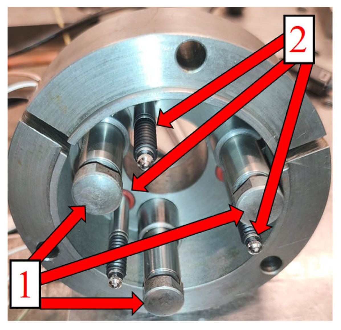 17]. For the bearings used, their nominal operating angle is 30 degrees, ensuring proper spindle stiffness in both the radial and axial directions. In the tests, a force of 200 N was used as the initial value, corresponding to the average preload at which the bearings operate at their nominal angle. This approach was dictated by the desire to vary the preload across its full range, so that the control system could both increase and decrease it. To ensure proper operation of the active system, each piezo actuator was placed symmetrically every 120 degrees relative to the spindle axis. Individual positioning was also ensured, and its correct positioning was adjusted using adjustment screws that allowed for precise setting of the bearing preload value [