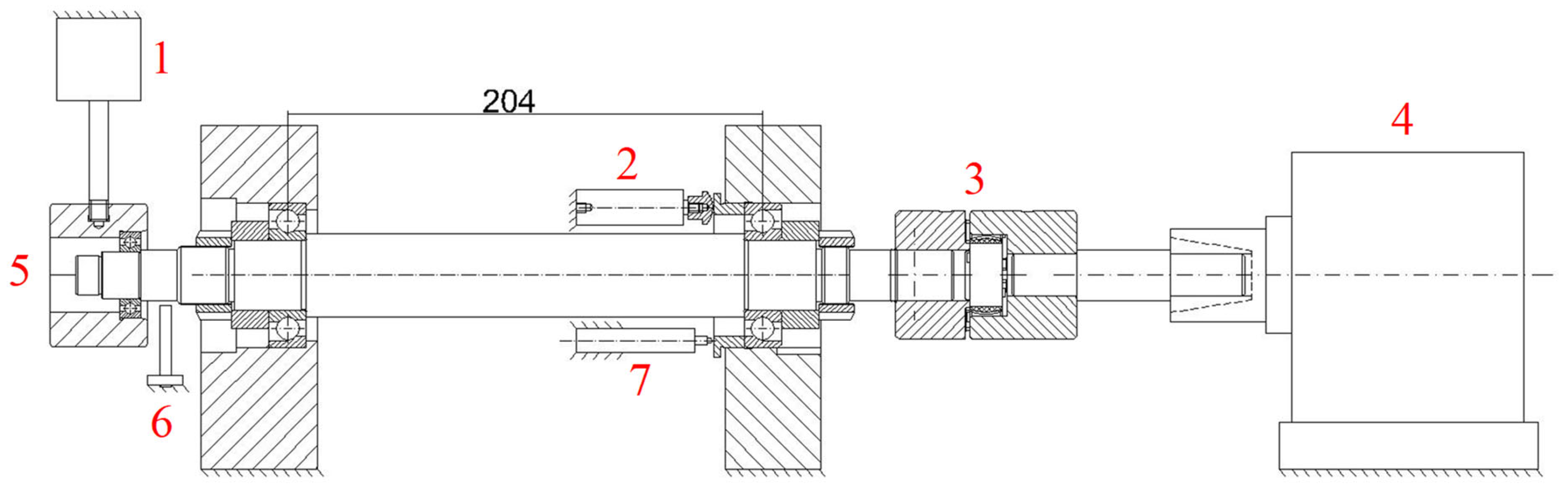 To conduct the tests, a proprietary test stand was designed and constructed, along with a model spindle system. The test stand configuration used at this stage of the research was based on a spindle supported by two bearing supports with a spacing of 204 mm, each equipped with B7206-CT-PS4-UM angular contact ball bearings from FAG [