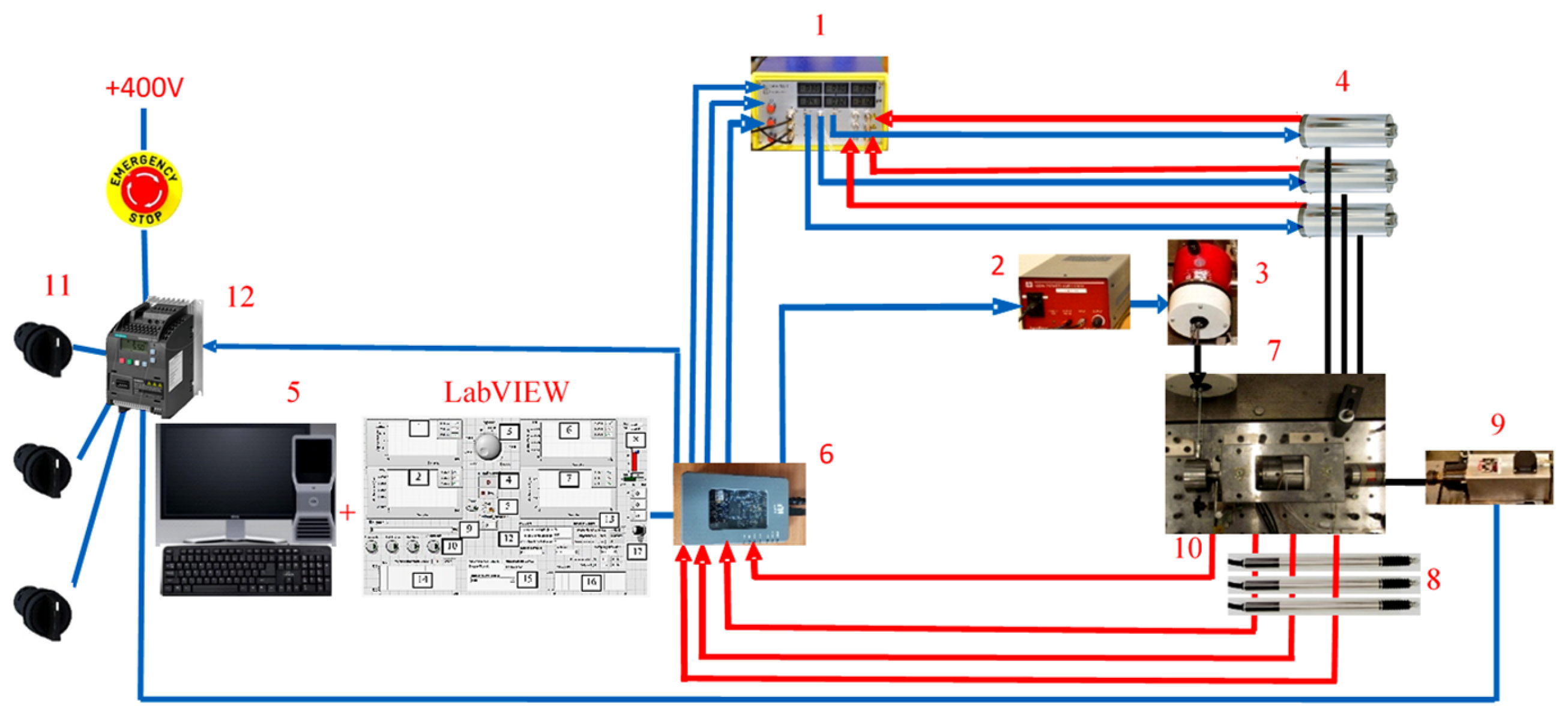Figure 6. The blue lines represent control signals coming from MyRio. Control is implemented for the spindle speed, the piezo actuator extension, and the vibrations generated by the exciter. The red lines represent feedback signals, which measure the relative displacement of the bearing raceways. The signal value from the strain gauges installed inside the piezo actuators can also be considered feedback, but in the presented solution, it is not directly used by the control application.
