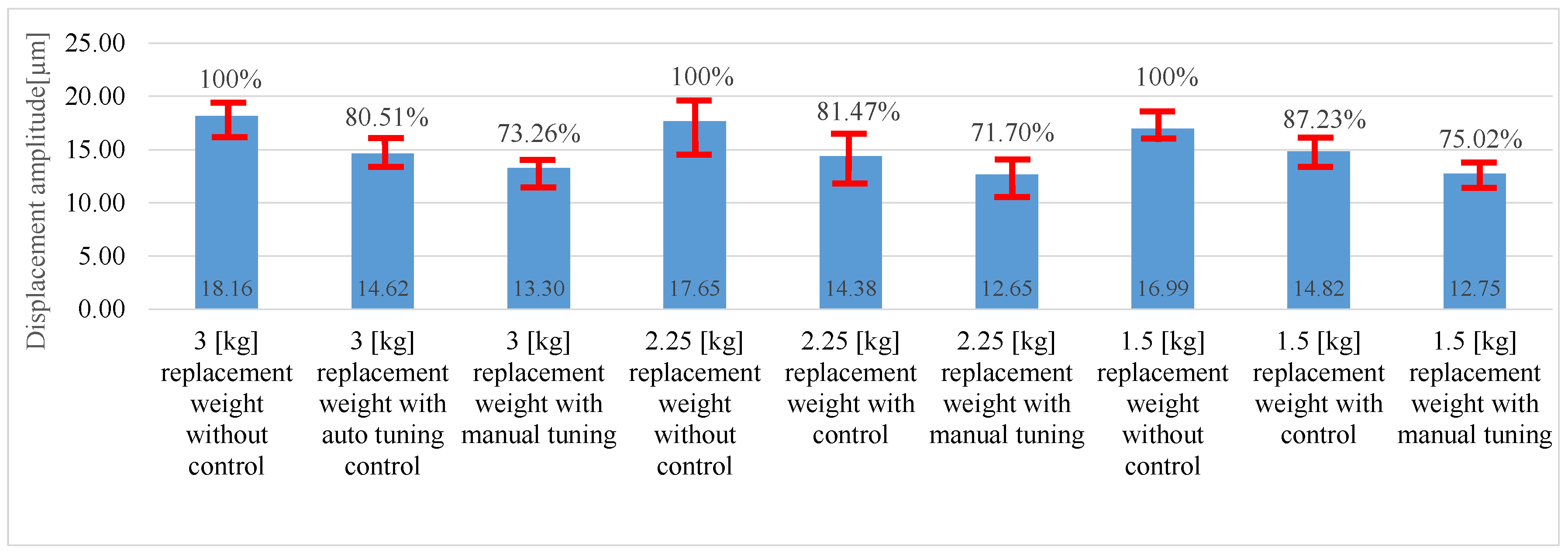 Figure 7). The values in the table and graph should be understood as the average value of five measurements. Additionally, the dispersion of the measurements was also determined, graphically indicated by a red line for each measurement section. The graph assumes that for the system without control, the displacement amplitude of the front spindle nose, determined as the average of five measurements, is 100%. In the system using the automatic tuning control system (for a 3 kg equivalent mass), the average displacement amplitude decreased by approximately 19.49%, which is 80.21% of the vibration amplitude without control. For the system with manual tuning, we obtained an amplitude reduction of approximately 16.74% compared to the system without control, which was 73.26% of the initial value without control. The remaining percentage values of the front spindle nose displacement amplitudes were determined in the same manner for the 2.25 kg and 1.5 kg equivalent masses.