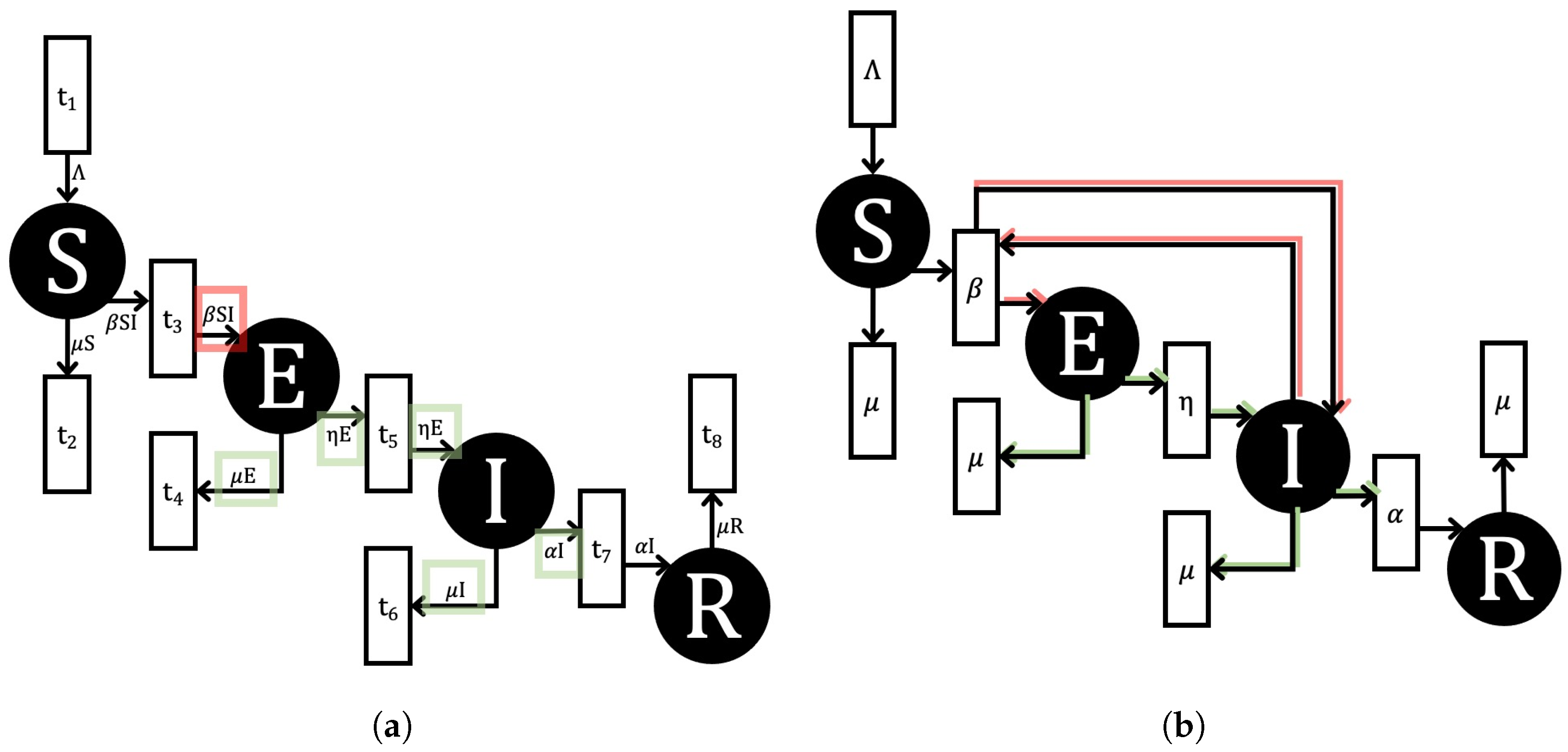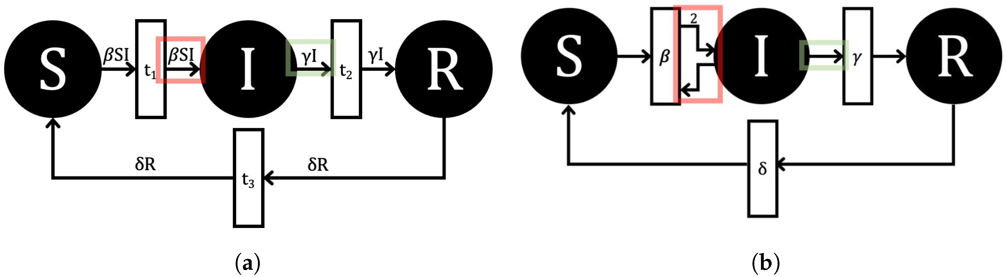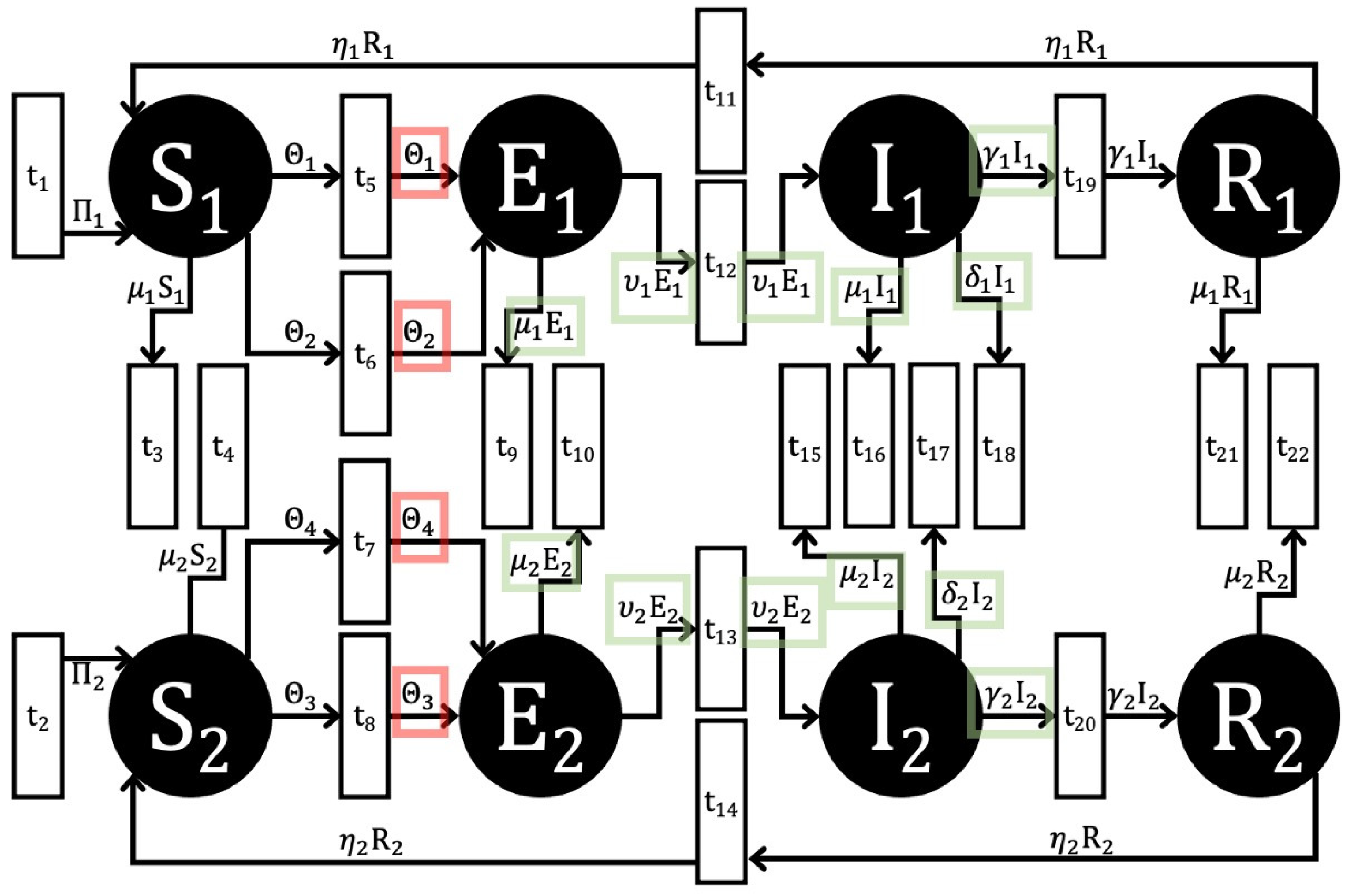 - If the marking of a place is zero (i.e., ), then no transition can consume tokens from place . Specifically, if a place is empty (i.e., no tokens are present in the corresponding place), no transition can have it as an input. This ensures that no “removal” of individuals (tokens) from an empty place occurs. Again, the definition of Petri Net preserves this assumption for all Petri Nets, as a transition can not fire if an input place has less tokens than the corresponding arc weight. If a place has no tokens (individuals), no transition can remove tokens from that place.