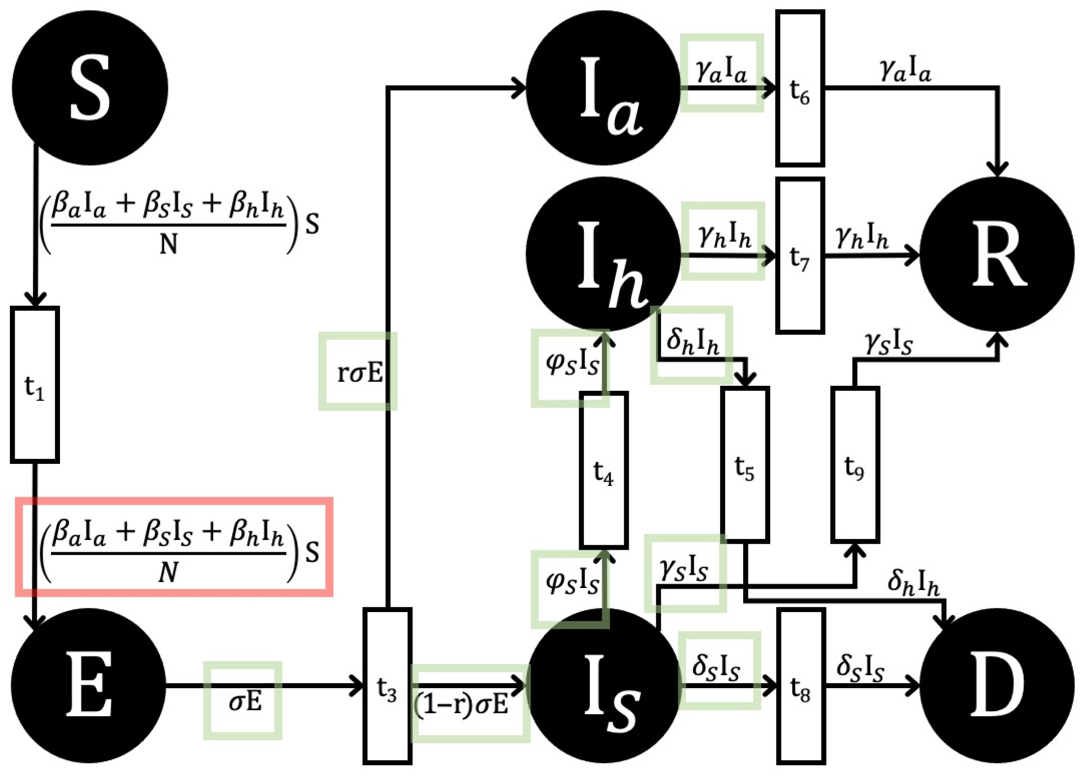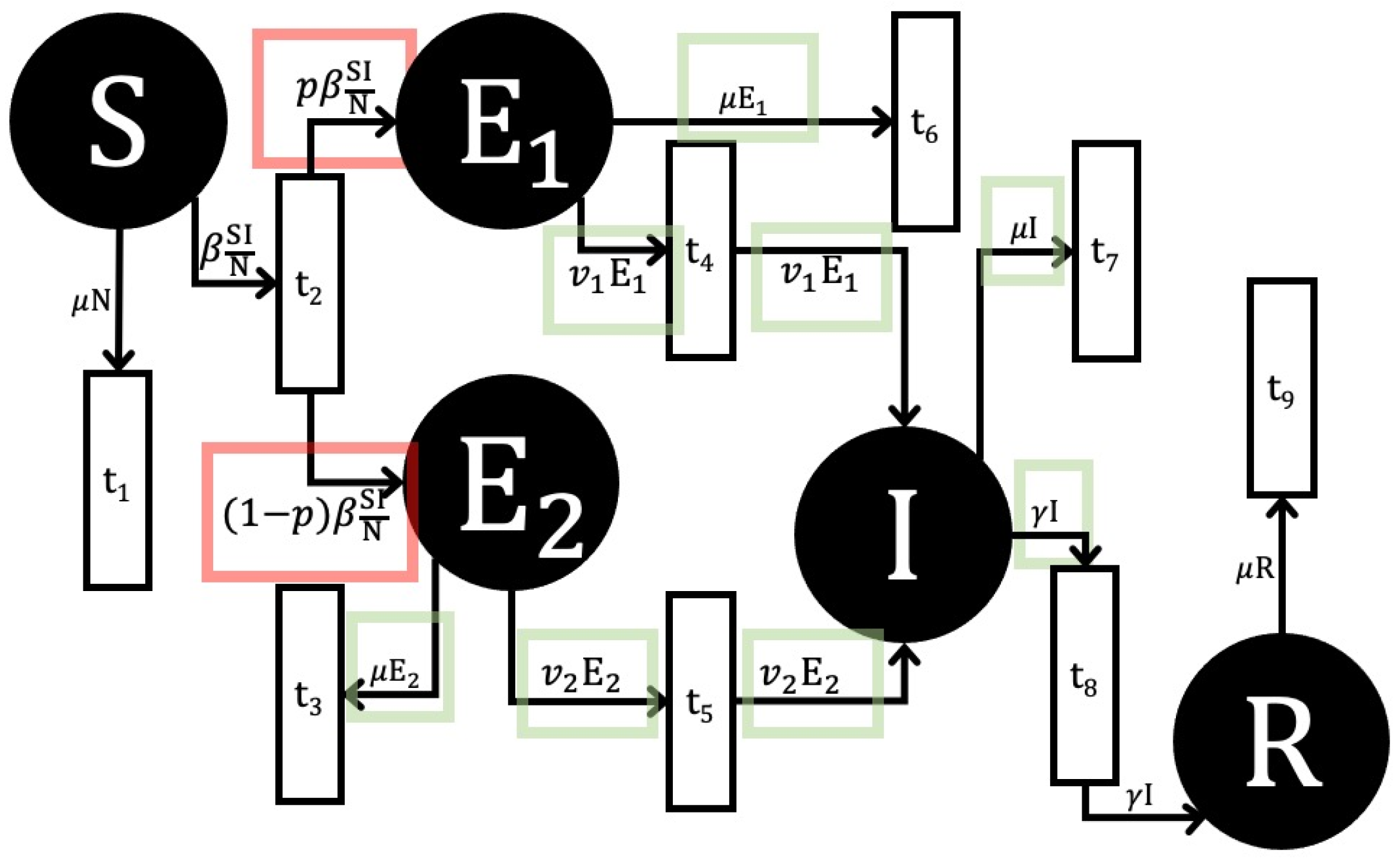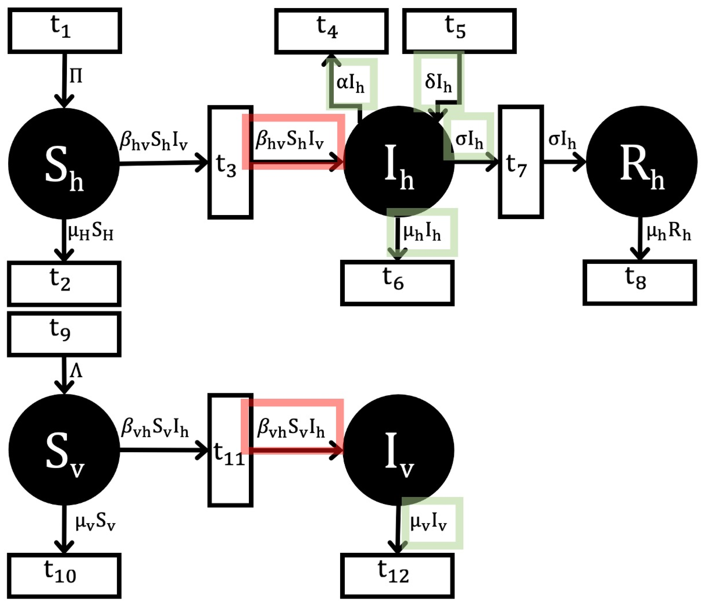 - Reckell, T.; Sterner, B.; Jevtić, P. The Basic Reproduction Number for Petri Net Models: A Next-Generation Matrix Approach. arXiv 2025. [Google Scholar] [CrossRef]